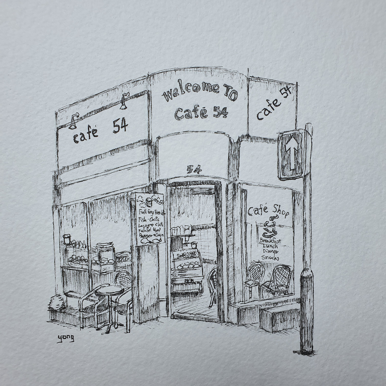 훗날 영국에서 찍은 풍경들 중에 그리면 좋을 사진을 찾는 중에 대학교 친구들과 만났던 카페를 찾았다. 사진만 봤는데도 앞서 얘기했던 '신호등에서 친구 이름을 크게 외쳤던 기억'이 자동응답기처럼 바로 떠올랐다. 그렇게 추억을 떠올리며 그려나갔다.