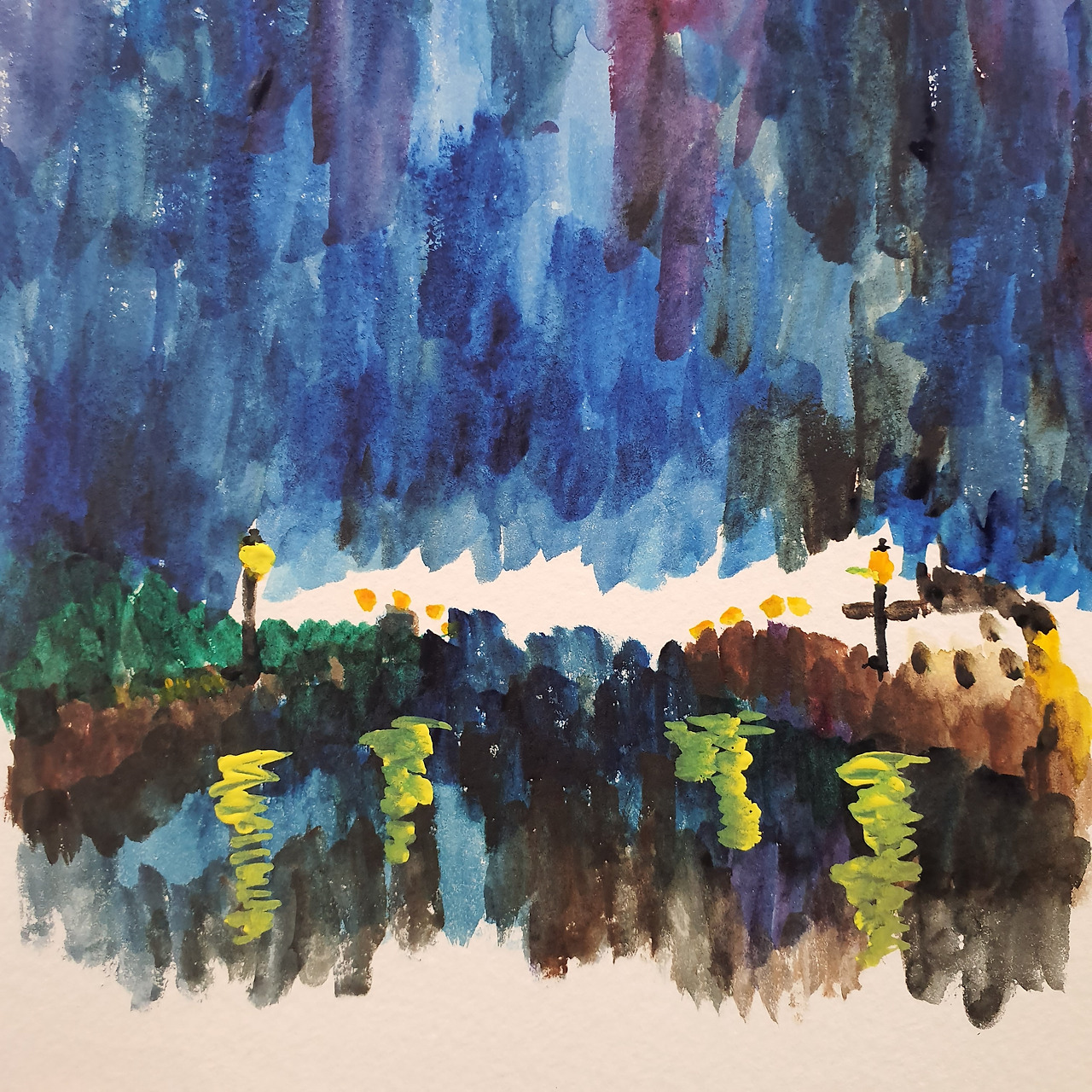 고흐 작품이 떠올라 나만의 방법으로 까를교 위 새벽 풍경을 표현하고자 수채화 물감과 종이를 준비했다. 마음 같아서는 캔버스 위에 아크릴 물감이나 유화로 질감을 살려 담아보고 싶었지만, 그릴 당시에 아크릴 물감과 캔버스가 없었다.