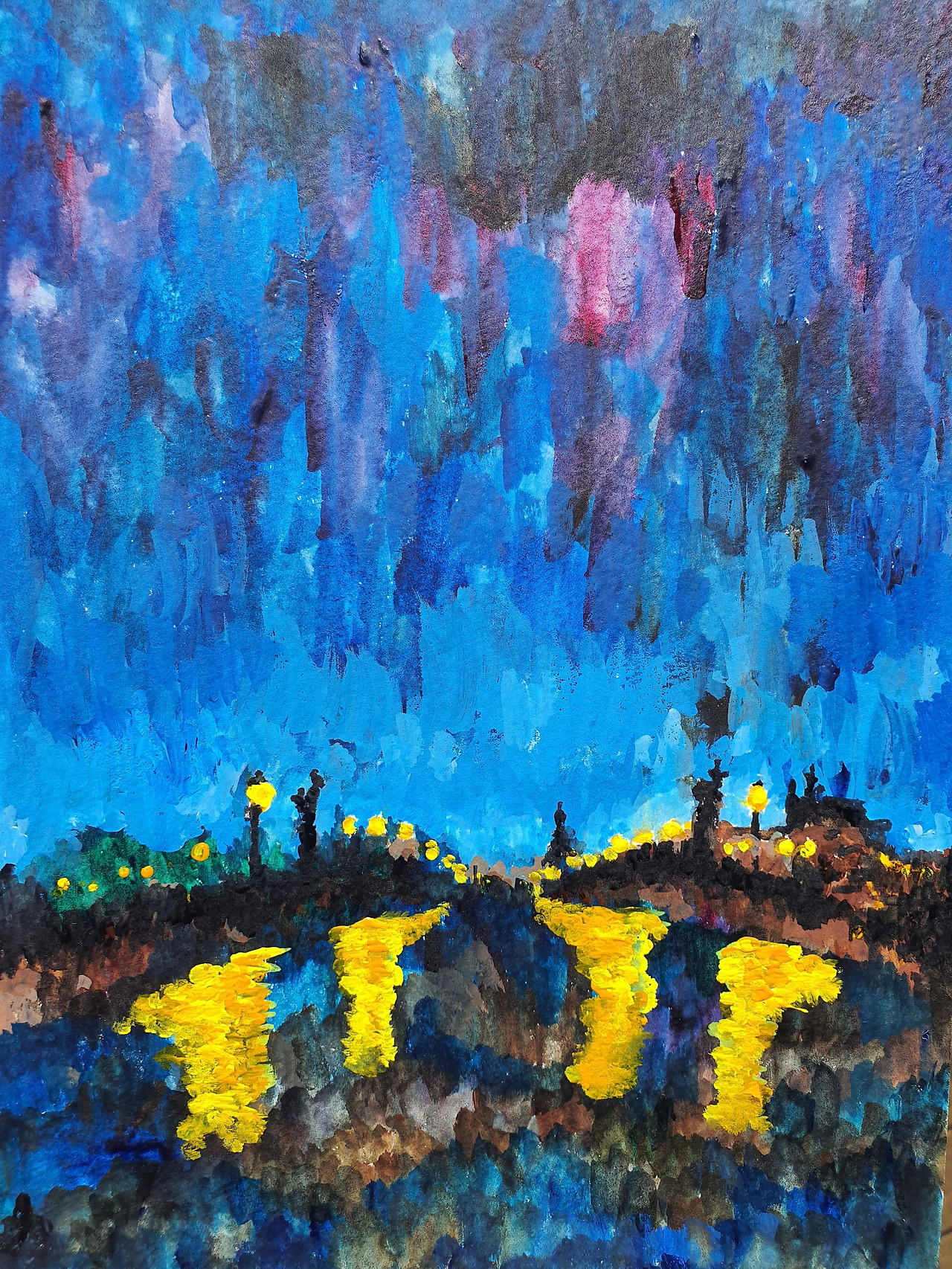 어떻게 보면 고흐의 작품을 따라 해 보고 싶었나보다. 그 작품 자체를 따라 해보고 싶었다기보다는 어두운 배경과 강에 비친 불빛을 표현해낼 때가 가장 궁금했고 어떤 생각이 드는지 간접적으로 느껴보고 싶었다. 그리고 그 처럼 강렬하면서도 잔잔하게 담아보고자 했다.