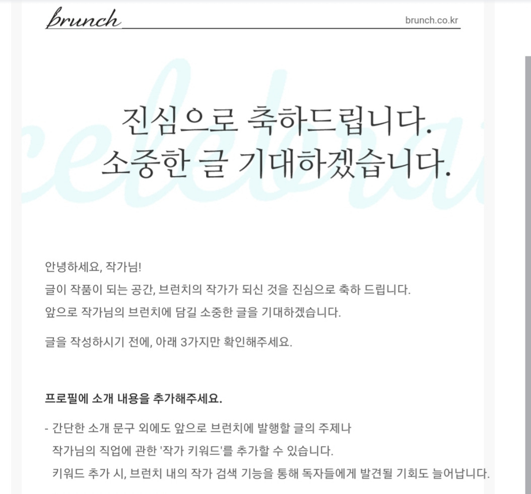 브런치팀의 작가 신청 합격 소식은 입사 합격 통보만큼이나 기뻤다. 스스로 원했던 목표를 실현할 수 있는 발걸음을 내딛을 수 있다는 것이 더 큰 감동이었다.