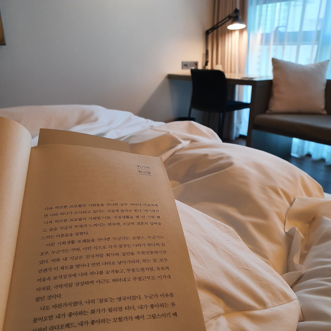 제일 먼저 짐을 풀고 침대에 앉아 책을 꺼내 들었다. 퇴사한 뒤 영국에서 살아보는 이야기를 담은 에세이였는데, 한번 더 읽고 싶어 챙겨 왔다. 베개 두 개는 두툼히 뒤에 포개 등을 기대는 데 사용했고 다른 한 개는 책을 놓을 수 있도록 이불 위에 올려놓고 책을 읽었다. 옆 탁자에는 조금 전에 사 왔던 아이스 아메리카노를 놓고 마시면서 기분 좋게 읽어 내려갔다. 폰은 무음으로 바꿔서 돌려놓은 채 책에만 집중할 수 있어서 행복했다.