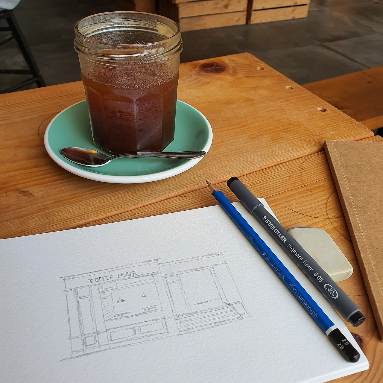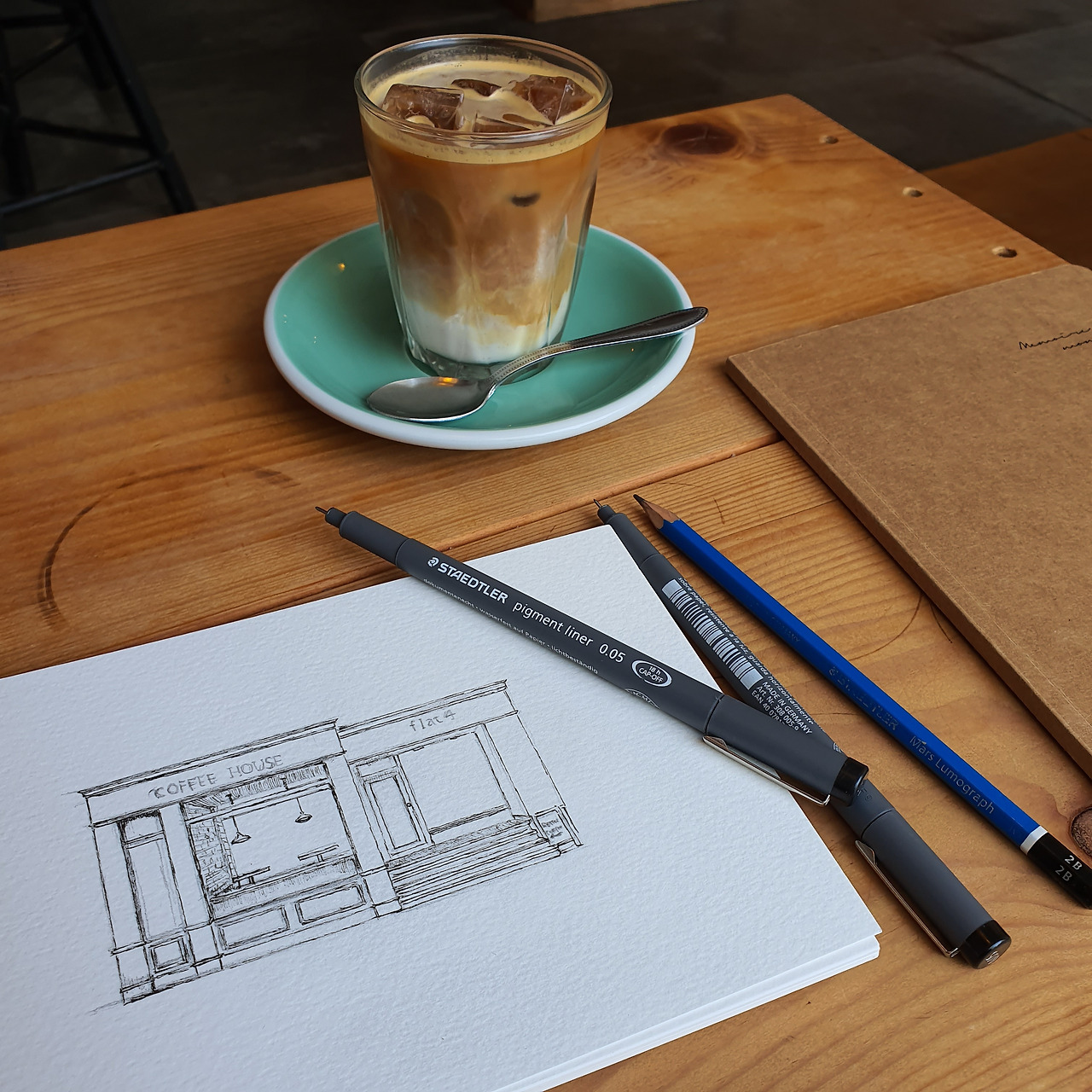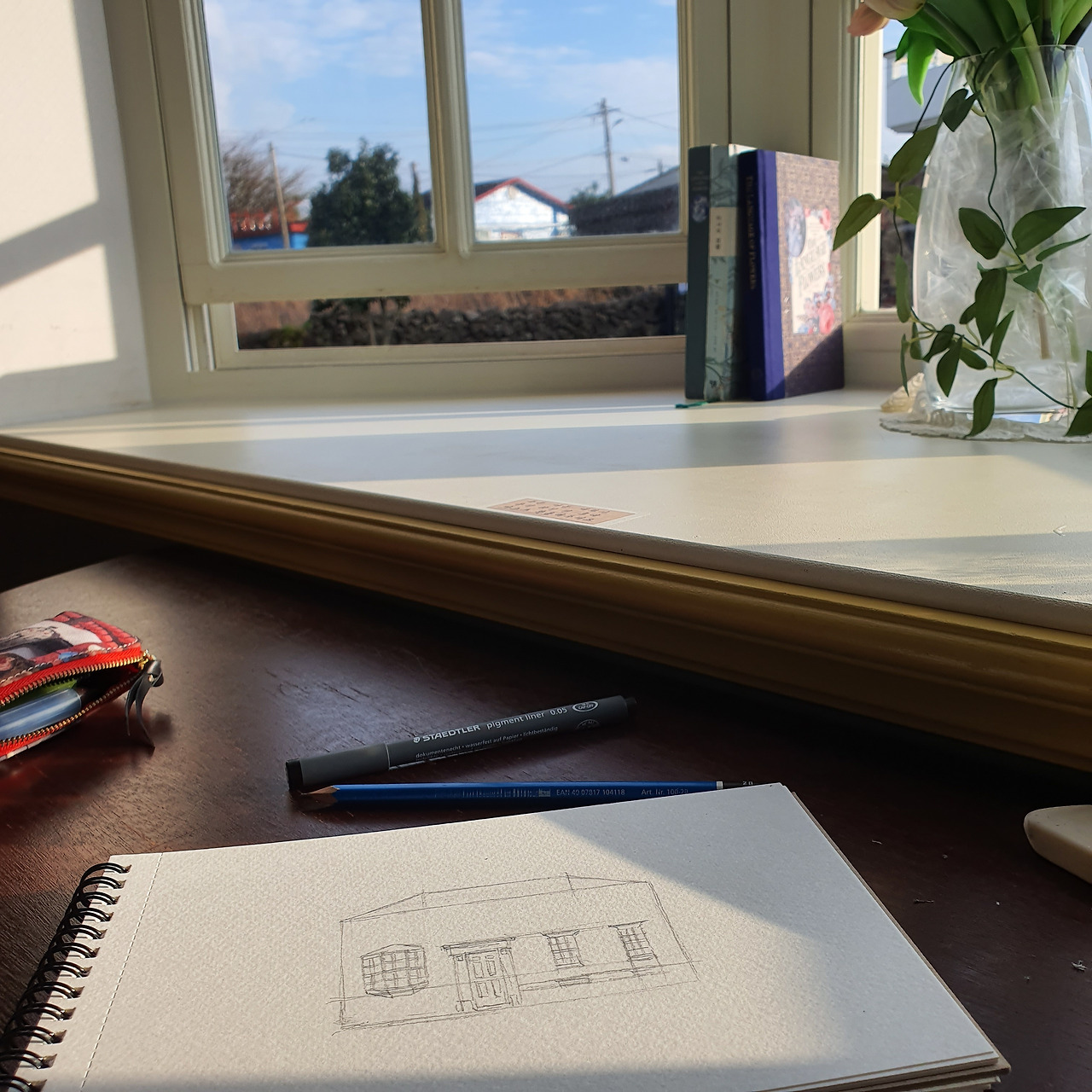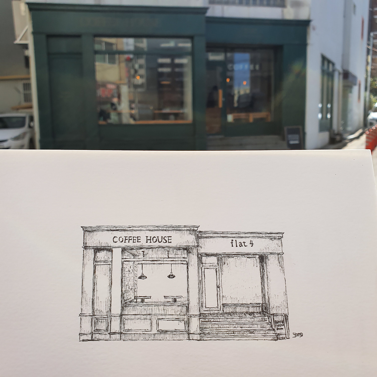 처음 제주 여행을 계획하면서 예쁘게 꾸며진 카페들을 그려가는 것은 어떨까라는 생각을 했었다. 엄밀히 얘기하자면 카페에서 나의 모습을 담기보다는 여행지에 있는 멋진 카페를 그려서 실제 모습과 나의 그림을 함께 사진으로 담고 싶었다. 어떻게 보면 그림을 그리고 여행을 추억하고 싶은 마음이 우러나왔기 때문이 아닐까 싶다. 한정된 시간만이 나에게 허락되었다는 현실과 제주도의 아름다운 다른 풍경도 담고 싶은 나의 욕심 때문에 카페만 다니며 그릴 순 없었다. 결국 여행의 주가 카페 모습을 그리는 것은 아니었기에 몇 곳만 가서 펜으로 담아보기로 했다.