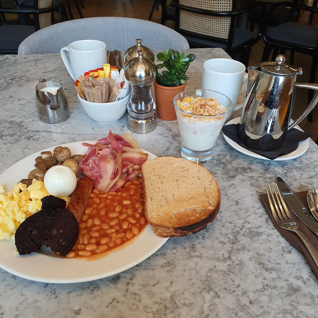 영국에서 유럽의 다른 나라로 여행 떠났을 때, 그때 머문 숙소에서 조식을 신청해봤다. 영국은 아니었지만 기본적으로 빵류, 해쉬브라운, 베이컨, 소시지, 다양한 종류의 햄과 소시지, 버섯 요리, 각종 치즈, 스크램블 에그, 계란 프라이 혹은 삶은 계란 등의 든든하게 채울 수 있는 음식과 요거트 혹은 우유에 타 먹을 수 있는 시리얼, 과일도 있고 아메리카노, 과일주스, 우유 등 마실거리도 있었다. 민망하지만 다 내가 좋아하는 것들 뿐. 숙소의 가격 수준에 따라 구성 차이가 있긴 해도 기본적인 것들이 모두 있어서 잘 먹었다.