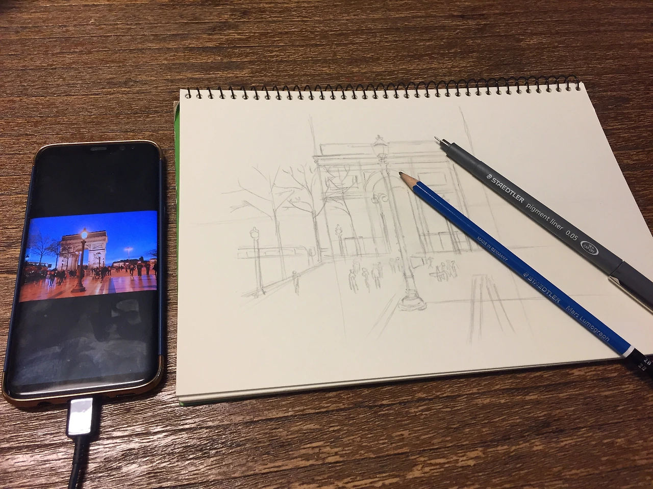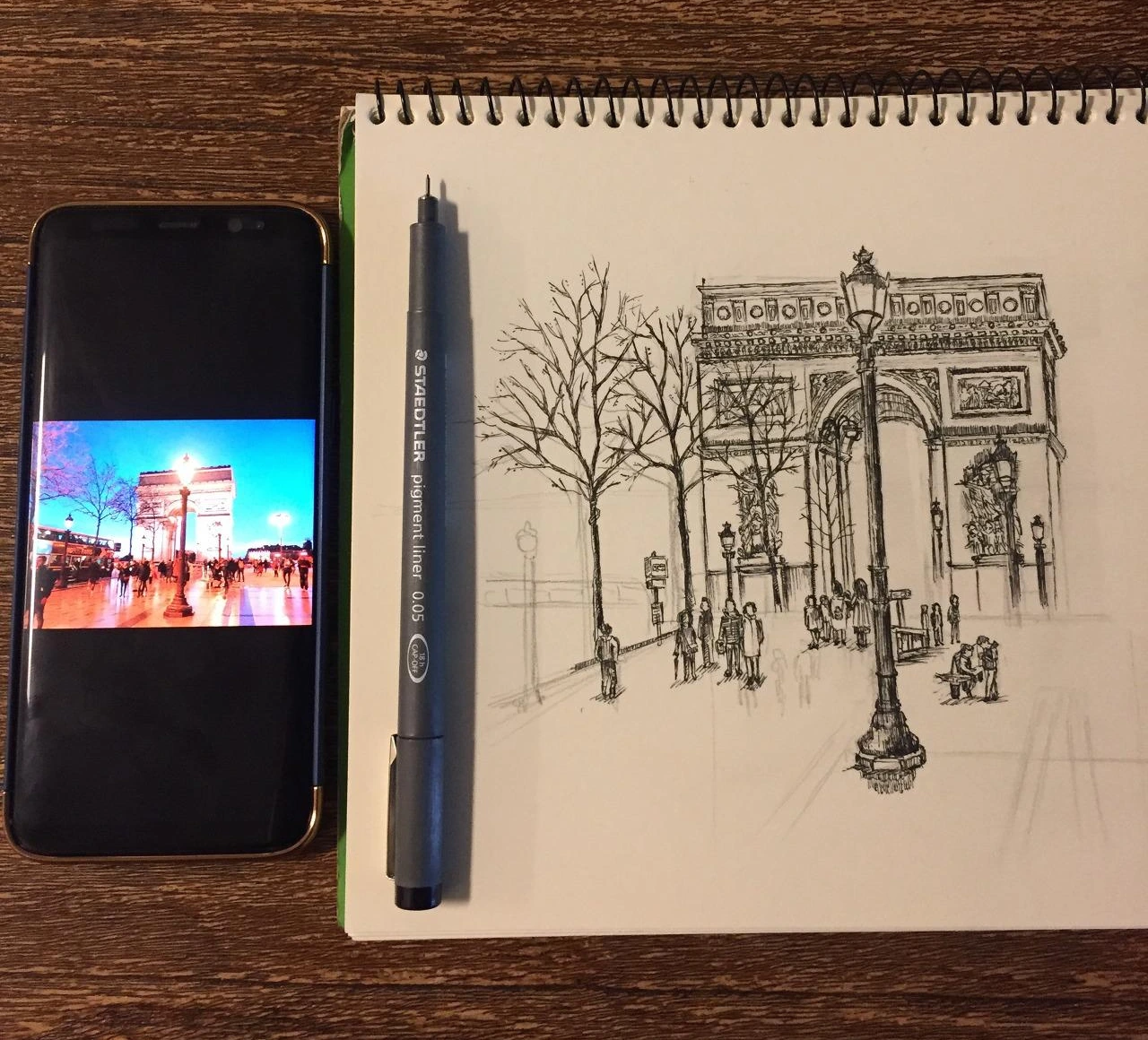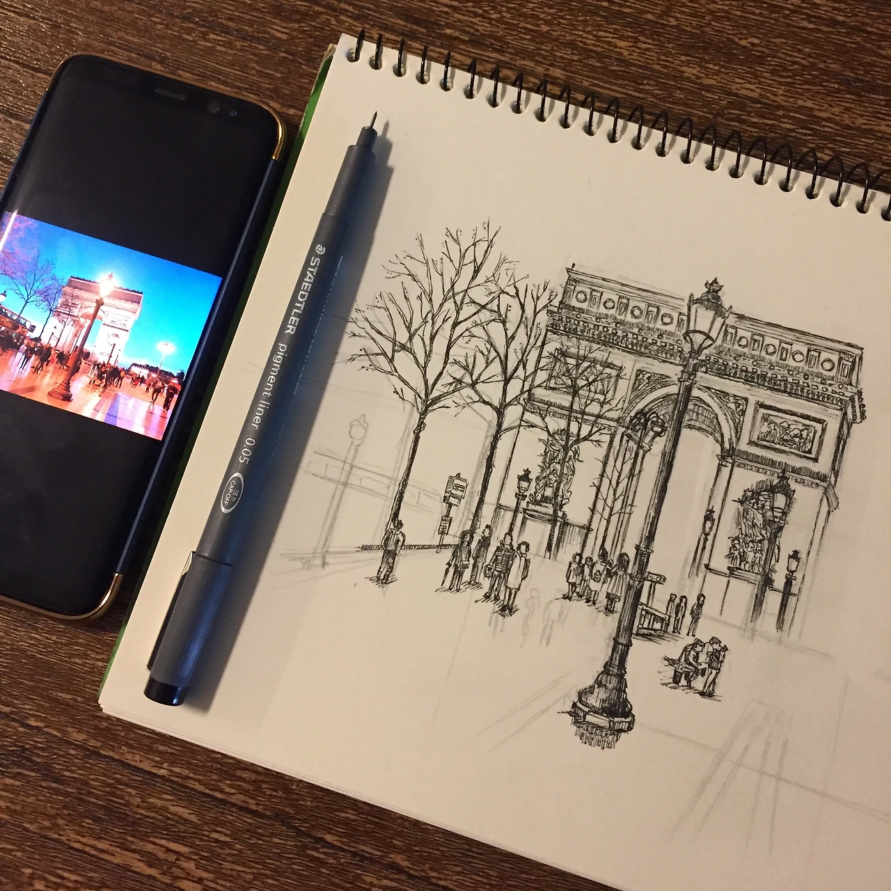 보통 드로잉 할 때에는 크게 두 가지, 직접 보면서 그리거나 풍경을 담은 사진을 보면서 그린다. 사진은 주로 내가 찍은 것을 보면서 드로잉 하지만 가끔은 주변 사람이나 지인들로부터 공유받은 사진도 그리곤 한다. 파리의 명소를 그릴 당시에 개선문을 그리고 싶어 사진에 진심인 형으로부터 여러 사진을 받았다. 일반적으로 담긴 개선문 사진은 있었지만 조금은 구도가 생소하면서도 몰입될 수 있는 모습을 담고 싶었다.