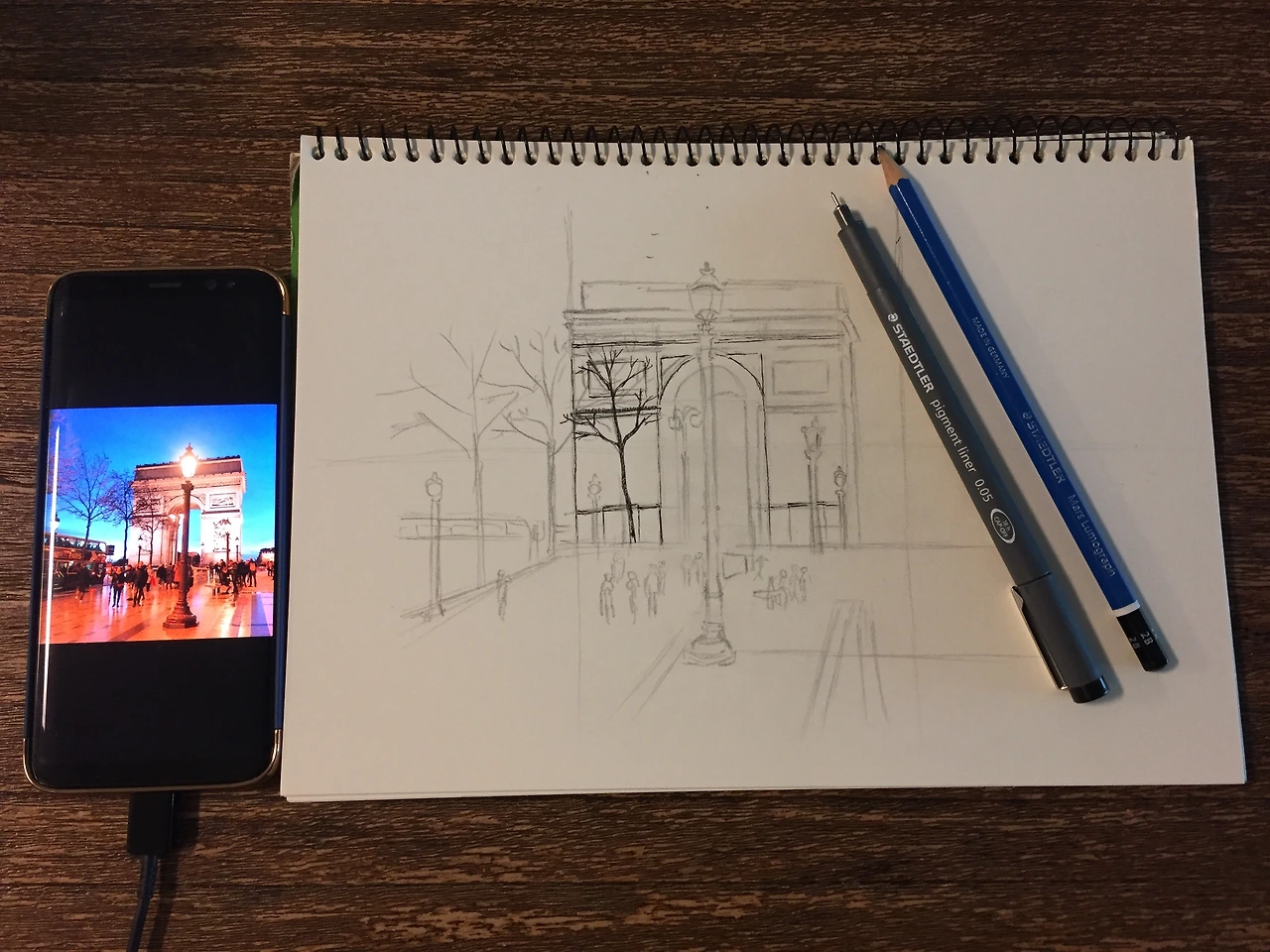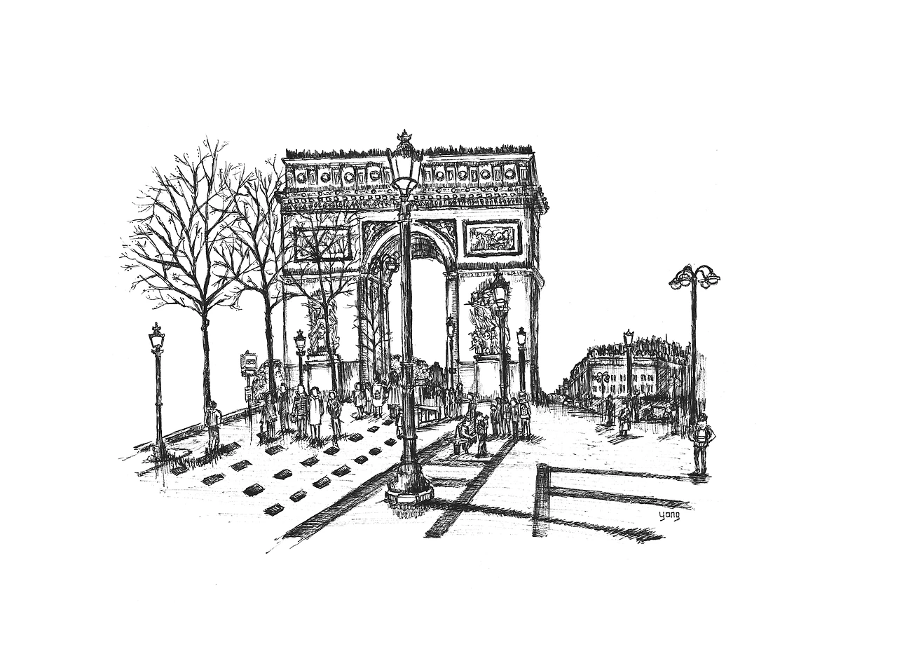 사진을 보다 보면 모두 담기에는 너무 많고 엄두가 안 날 때가 있기 마련이다. 그럴 때에는 단호히 생략한다. 중요한 것에만 집중해도 모자라기 때문에 핵심을 그리고 뒤편의 배경은 연하게 흐리는 작업을 한다. 멀리 있기에 그렇게 보이기도 하고 아득하게 표현하는 것이 원근감을 조금이나마 더 느껴지게 할 수 있고 개선문에 더 집중할 수 있게 해 주니까.