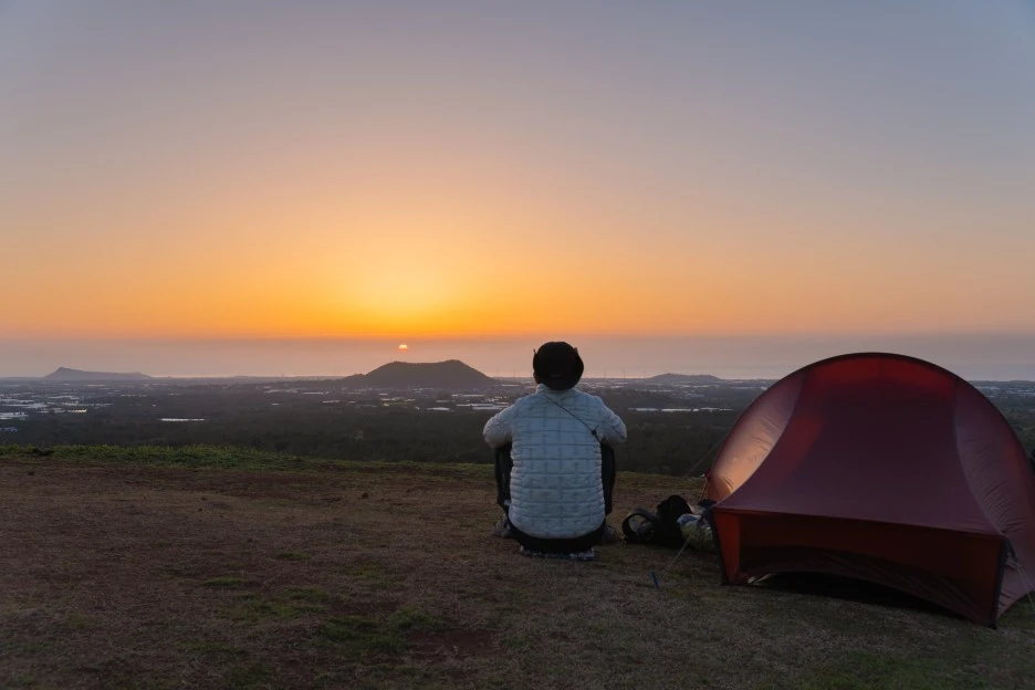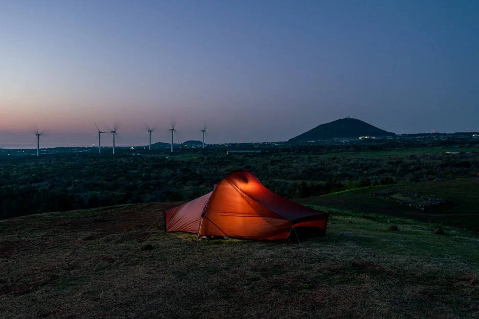 텐트를 치고 하루를 마무리한다. 그리고 문도지오름에서 제주도에서 지는 노을을 바라본다.