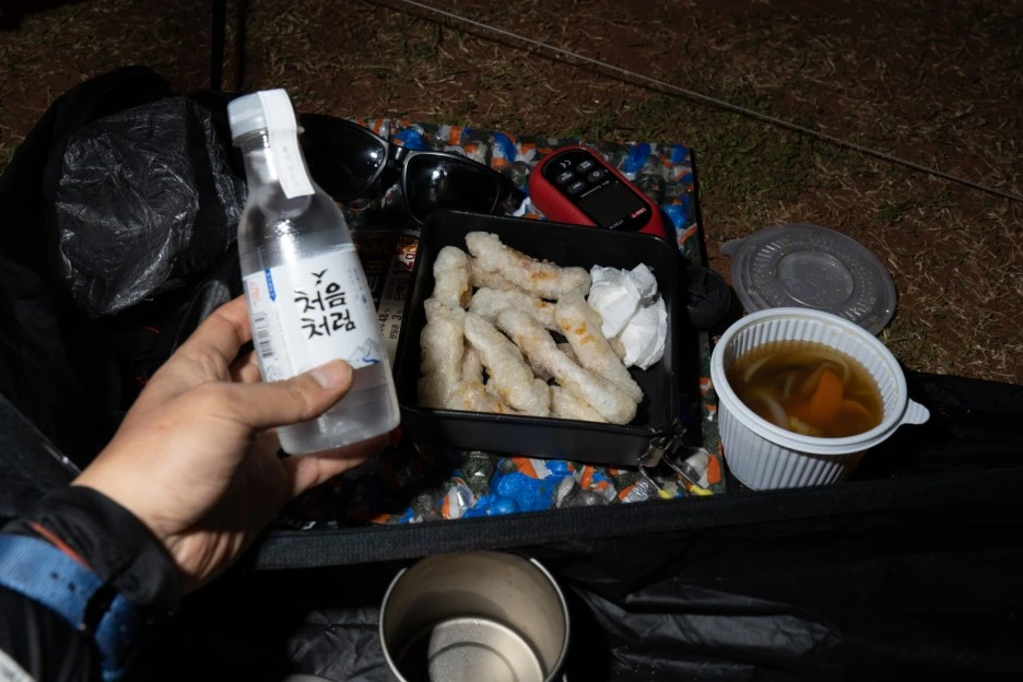 종점에 도착하긴 했지만, 문도지오름이 있는 14-1코스를 더 이상 걷기엔 너무 지쳐있었다. 문도지오름에서 먹을 야식과 물이 필요했고 근처 중화요리 음식점에 들러 오늘 밤을 준비한다. 또다시 한 시간가량 지났을까? 저녁으로 먹다 남은 찹쌀탕수육은 포장하고 근처 편의점에 들러 쇠주 한 병을 사서 문도지오름으로 향한다.
