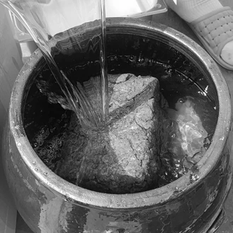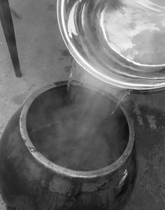 장을 담그기 전에 먼저 준비해야 할 것들이 많다. 그중 하나가 항아리 소독인데 짚, 쑥, 나무 등을 태운 그 연기의 작은 입자로 소독하는 연기 소독과 끓는 물을 부어서 하루 동안 물을 채워 놓은 후 다음날 버리는 소독을 같이 진행했다. 굉장히 사소하고 별것 아닌 작업인 것처럼 보이지만 미생물을 이용하는 작업인 만큼 소독만큼 또 중요한 작업도 없다. 연기 소독, 증기소독, 직화 소독, 알코올 소독 등 다양한 소독이 있지만 장을 담그기 전에 항아리는 깨끗하게 하는 작업은 다 같다.