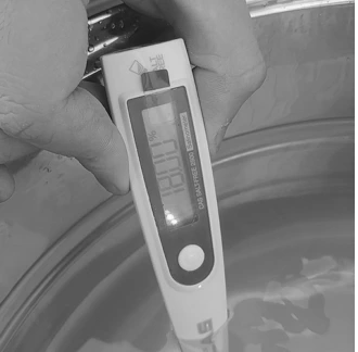 장을 사용하기 전날 장에 물을 채워 놓고 다음날까지 물이 새지 않으면 그 장독은 깨지지 않아 사용해도 좋다는 뜻이다. 더불어 소금도 하루 전에 물에 녹여 놓는다. 물과 메주 소금의 비율은 3:1:1 옛 어른들은 물론 부피로 계량했지만 무게를 이용해 더 정확하게 계량 작업에 들어간다. 메주의 무게를 재고 그에 맞춰 물을 3배 계량한다. 그리고 소금을 넣으며 염도를 맞춘다. 염도는 고농도 염도계를 이용해 18%를 맞춘다. 일반적으로 20%를 맞추지만, 18%의 결과물이 응용이 좋을 것이라 생각했다.
