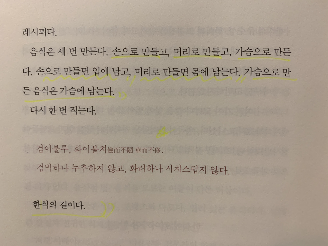 이 책은 비겁한 변명의 1. 의 변명이 아니었다. 옳고 그름을 가려 사리를 밝히는 2. 의 변명이다. 진짜 좋은 제목은 글을 다 읽고 고개가 끄덕여지는 것이라고 했다. 그렇다면 제대로 변명했다. 앞서 밝혔듯이 이 모든 주장을 전부 동의하지는 않는다. 작가, 평론가, 기자는 흠 없는 사실을 말하는 것이 아니라고 생각한다. 대중으로 하여금 문제의식을 고취하며 본질적인 문제에 대해 깊게 생각할 기회를 주는 사람들이다. 책 ‘한식을 위한 변명’을 비교적 오래 읽었다. 재미없어서가 아니라 재미있어서 오래 걸렸다. 생각할 시간을 선물해준 작가님께 감사하며 글을 마친다.