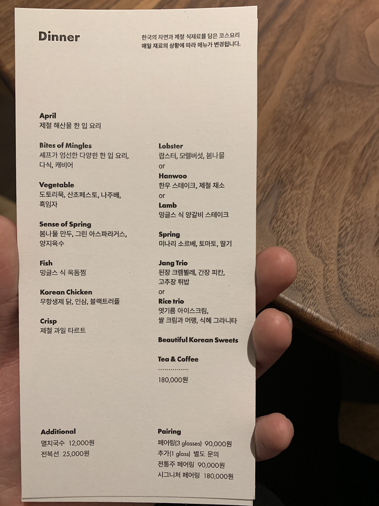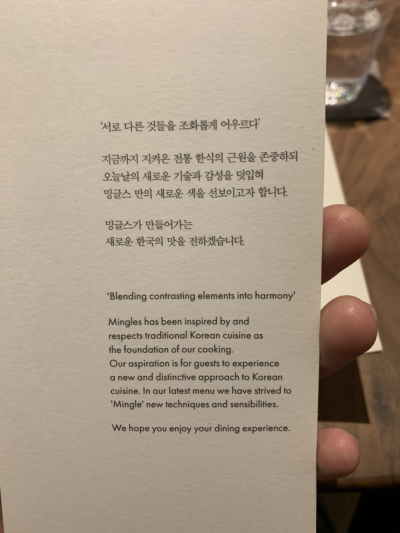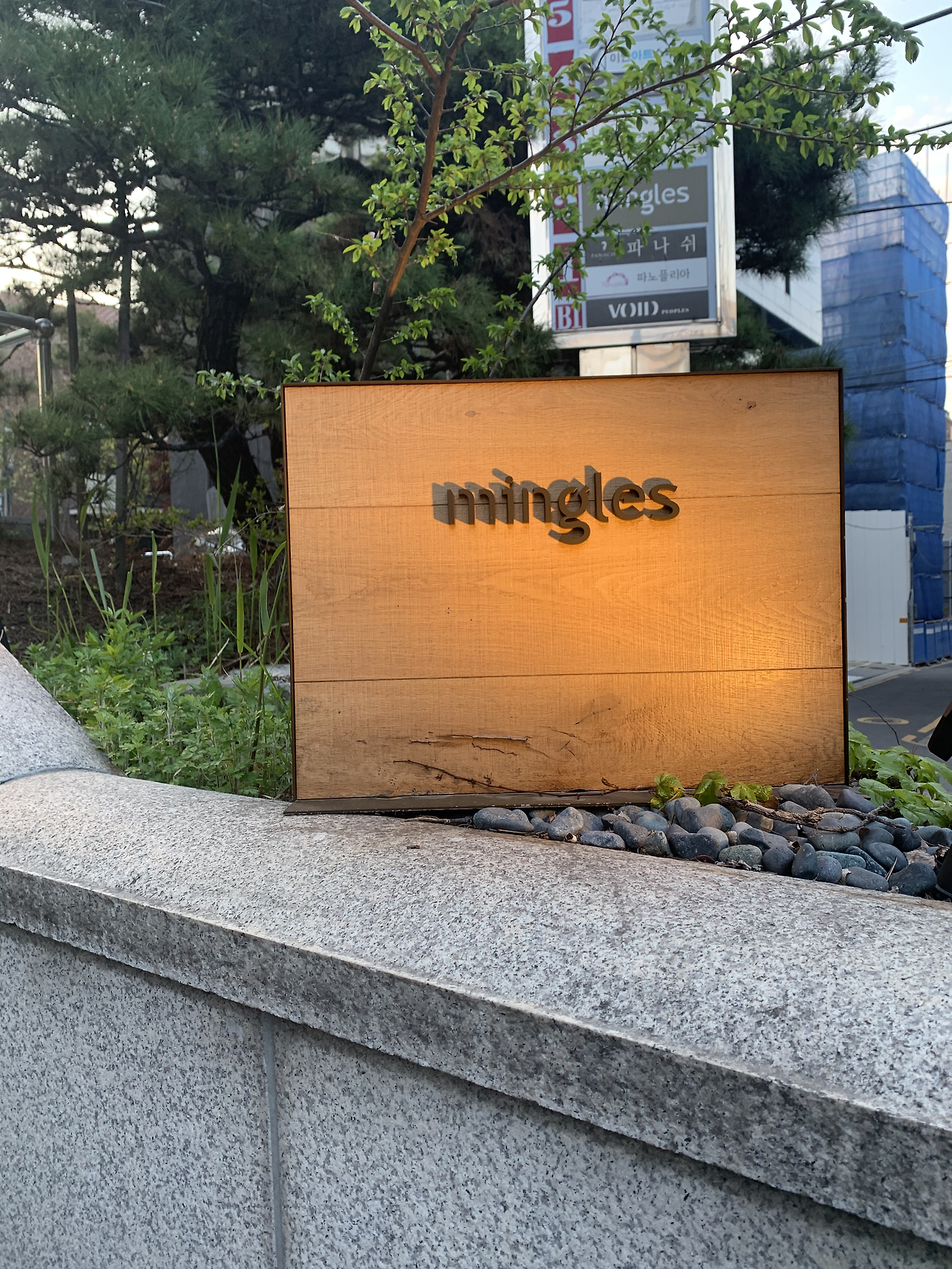 대학교에서 요리를 배울때부터 너무 가고 싶었던 공간이었고 먹고 싶었던 음식들이다. 한국에서 요리를 하는 사람에게 밍글스는 꿈의 레스토랑이다. 새로운 한식을 선보이기 가장 어려운 곳이 아이러니하게도 한국임을 인정하면 사실 밍글스는 모던 한식, 뉴코리안이라는 한식문화를 선도하고 그 문화를 인정받았다는 것만 해도 너무 대단한 곳인데 와서 직접 먹어보니 고개가 끄덕여진 맛이었다. 앞서 밍글스에게 주고 싶었던 단어가 ‘perfect’였다. 식재료 간의 조화, 장소와 직원들의 조화, 5가지 맛의 조화 또한 너무 완벽했다. 그리고 마지막으로 가장 완벽한 것은 전통을 지키려 하는 마음과 그것을 새로운 한식으로 선보이는 생각의 조화가 적절하고 완벽했다. 이런 레스토랑이 앞으로도 많아졌으면 좋겠다는 생각을 하며 오늘은 이만 글을 마무리하련다.