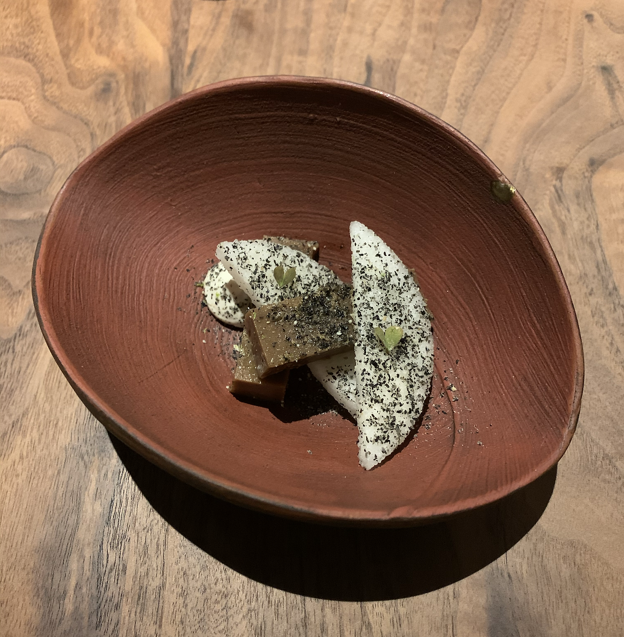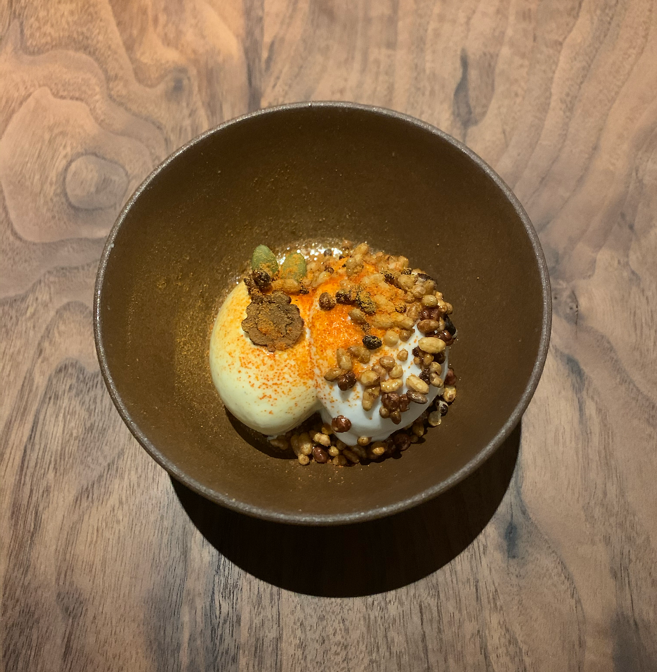 재밌는 음식이 저 엿기름 아이스크림이 었는데 일반적인 다른 파인 다이닝에서 제공한 식혜 소르베에서 식혜의 맛을 느낄 수 없어서 아쉬웠다면 엿기름 아이스크림에는 엿기름의 뉘앙스가 너무 직관적이어서 좋았다. 이건 누가 먹어도 식혜의 맛!! 사용한 재료를 직관적으로 풀어내는 것을 좋아하는 나로서는 너무 인상적인 디저트였다.