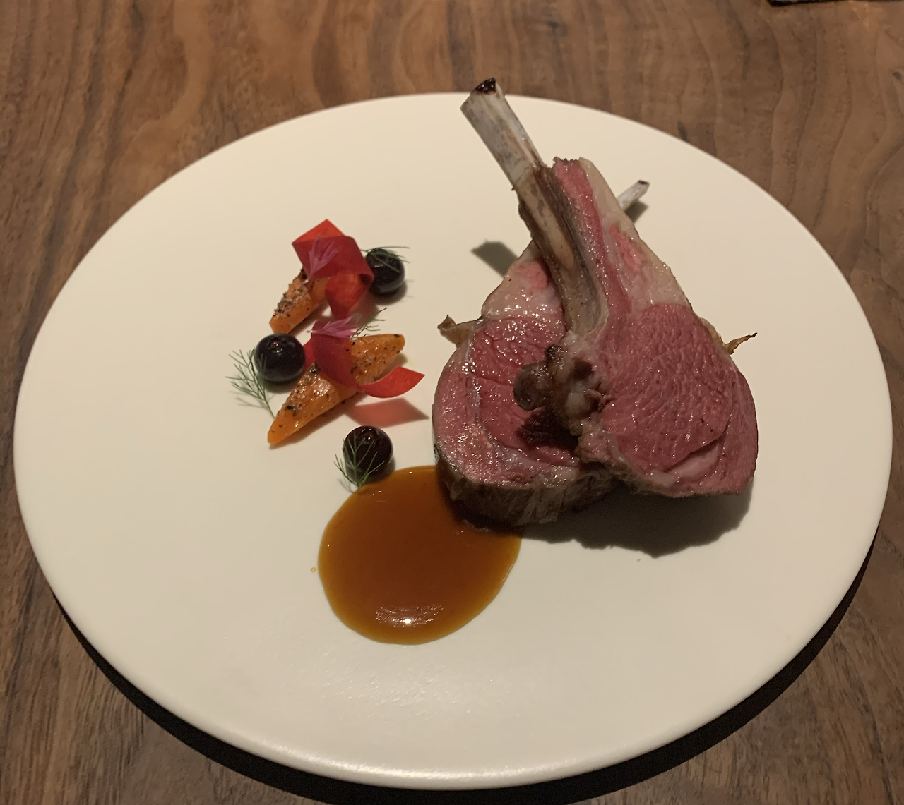메인은 양갈비, 랍스터, 한우 세 가지 중에 선택할 수 있는데 워낙 양고기를 좋아하는 지라 양갈비를 선택했다. 놀랐던 것은 양이다. (량) 갈빗대를 2대 주셨다. 사실 고기양이 많아 좀 놀랐고 또 중간중간 있는 야채들이 고기에 있어 재미난 요소들이었는데 같이 뿌려져 나오는 고수 파우더라던지 블루베리 장아찌 같은 요소들이 너무 신선했다. 굽기는 뭐 먹어본 양고기 중 가장 완벽