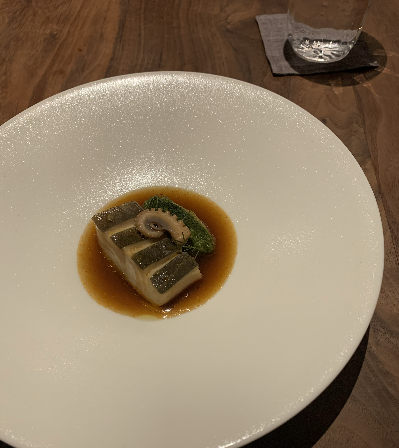 사실 우리 테이블은 병어(덕자)가 사용됐다. 뭐 워낙에 고급 생선이어서 당연히 맛있겠지 하고 먹었는데 진짜 익힘 정도가 대단했다 생선이 입에서 주르륵 녹는데 식감이 한결 한결 살아있었다. 같이 나온 소스와 호박 튀김도 너무 잘 어울렸다 다만 조그마한 문어다리의 역할은 고명이겠지? 살짝 부드러운 생선조림을 먹는 뉘앙스의 디쉬였다. 또 한식을 이렇게 해석하니 우리가 평소 먹던 생선조림이 이렇게 해석될 수 있구나 생각이 들었다.