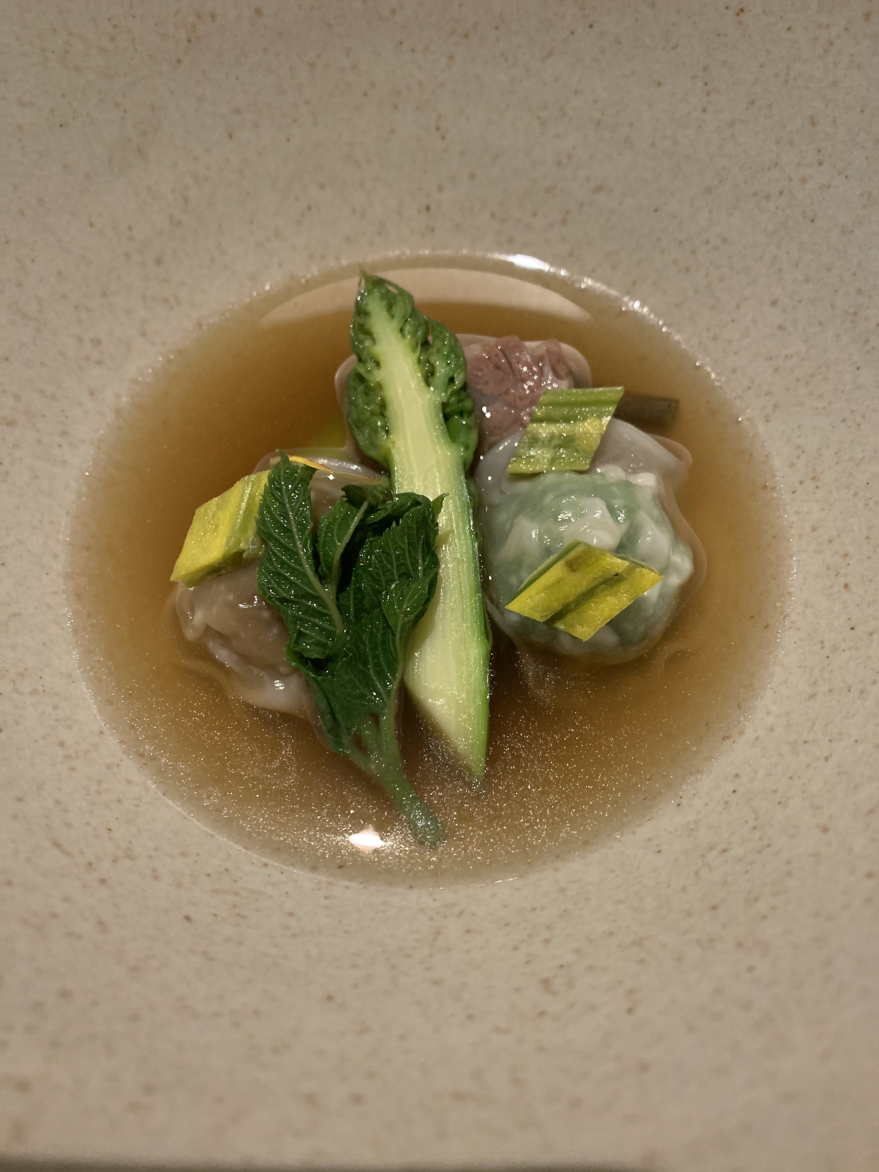 딱 봐도 너무 맛있는 음식이 나왔구나 생각했는데 한입 먹자마자 거의 탄성을 내지른 음식 중 하나다. 먼저 양지 육수를 한 모금 마셨는데 감칠맛이 대단했다. 곧이어 초록색 만두를 먹었다. 방풍과 게살이 들어간 만두였다. 방풍 향과 게살의 향이 은은히 양지육수와 손잡았다. 다음은 갈색 만두였는데 돼지 감자과 관자를 이용한 만두이다. 사실 돼지감자의 향이라는 것을 사용하면서도 인지 하지 않았는데 먹자마자 ‘ 이건 돼지감자다.’라는 생각을 하게 될 정도로 돼지감자의 향과 관자의 부드러움이 동시에 나온다. 같이 준비해준 미나리초대와 땅두릅 역시나 적당한 조리 정도로 향과 지루한 맛을 재미나게 하는 역할을 한다.