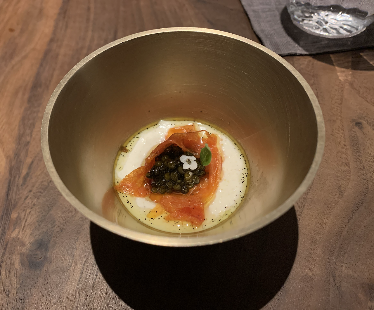 두 번째 한입 요리가 정말 대단했는데 이 날 먹은 음식 중 가장 조화롭고 창의적인 음식이었다. 부라타 치즈와 바닐라빈을 넣고 로스팅한 참기름 그리고 수박을 말려 새콤달콤하게 절여 그위에는 캐비어가 올라가 있었다. 자칫 잘못하면 너무 붕 뜬 음식이 될 수 있었는데 부라타 치즈가 둥글게 음식을 잡아줬고 말린 수박이 음식의 재미를 줬다. 또 가장 인상적이었던 것이 바닐라빈으로 로스팅한 참기름인데 정말 이 창의적이라는 생각을 했다. 이것이 밍글스러움이구나 느낀 음식