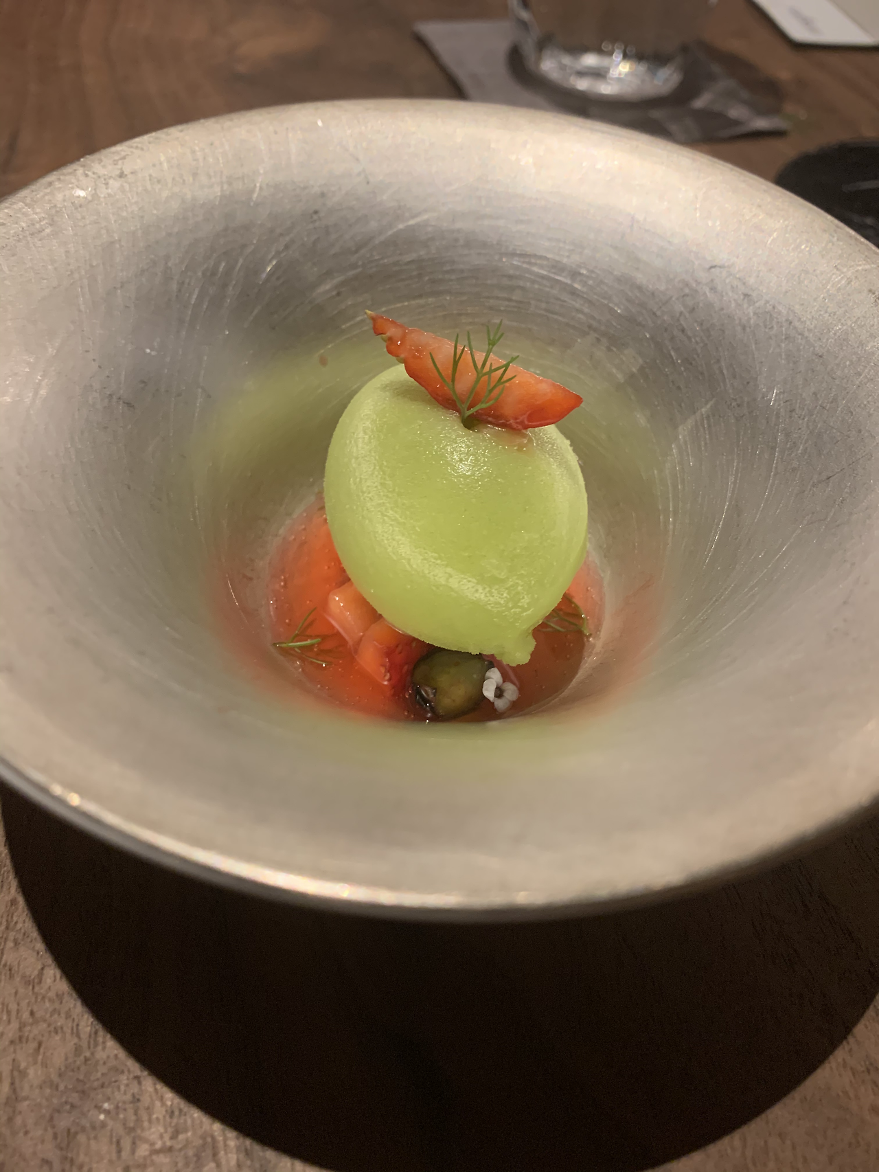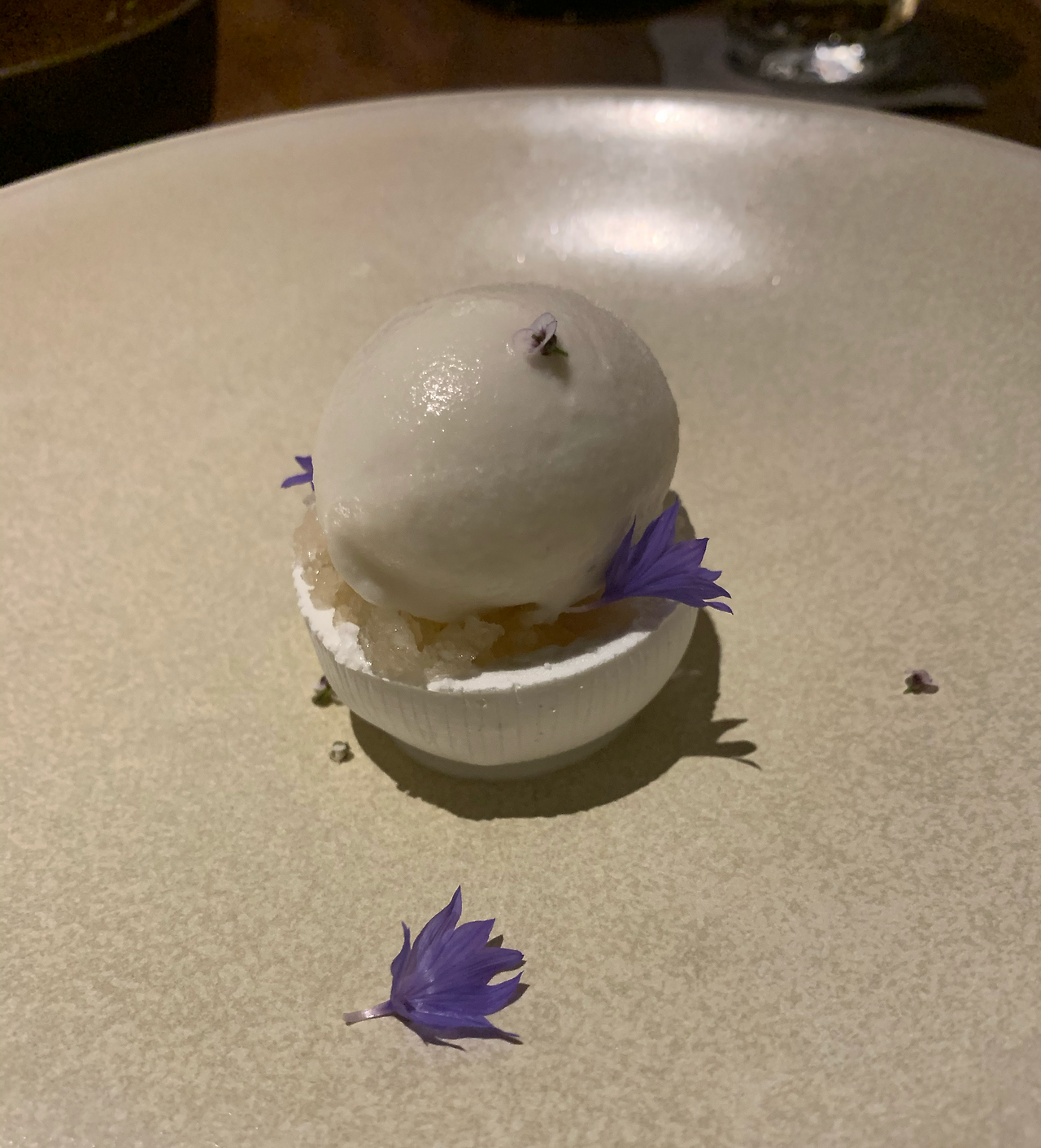 미나리로 만든 소르베다. 미나리라는 것을 이용해 무엇인가를 만들 수 있구나 생각을 하지 못했는데 이렇게 창의적인 생각을 이토록 완벽하게 재현한다는 것이 진짜 실력 있는 레스토랑이구나 생각하게 된 포인트이다. 미나리와 함께 사과의 향이 같이 나는 것 같았다. 미나리의 향이 이렇구나 느낄 수 있었던 좋은 메뉴였다.