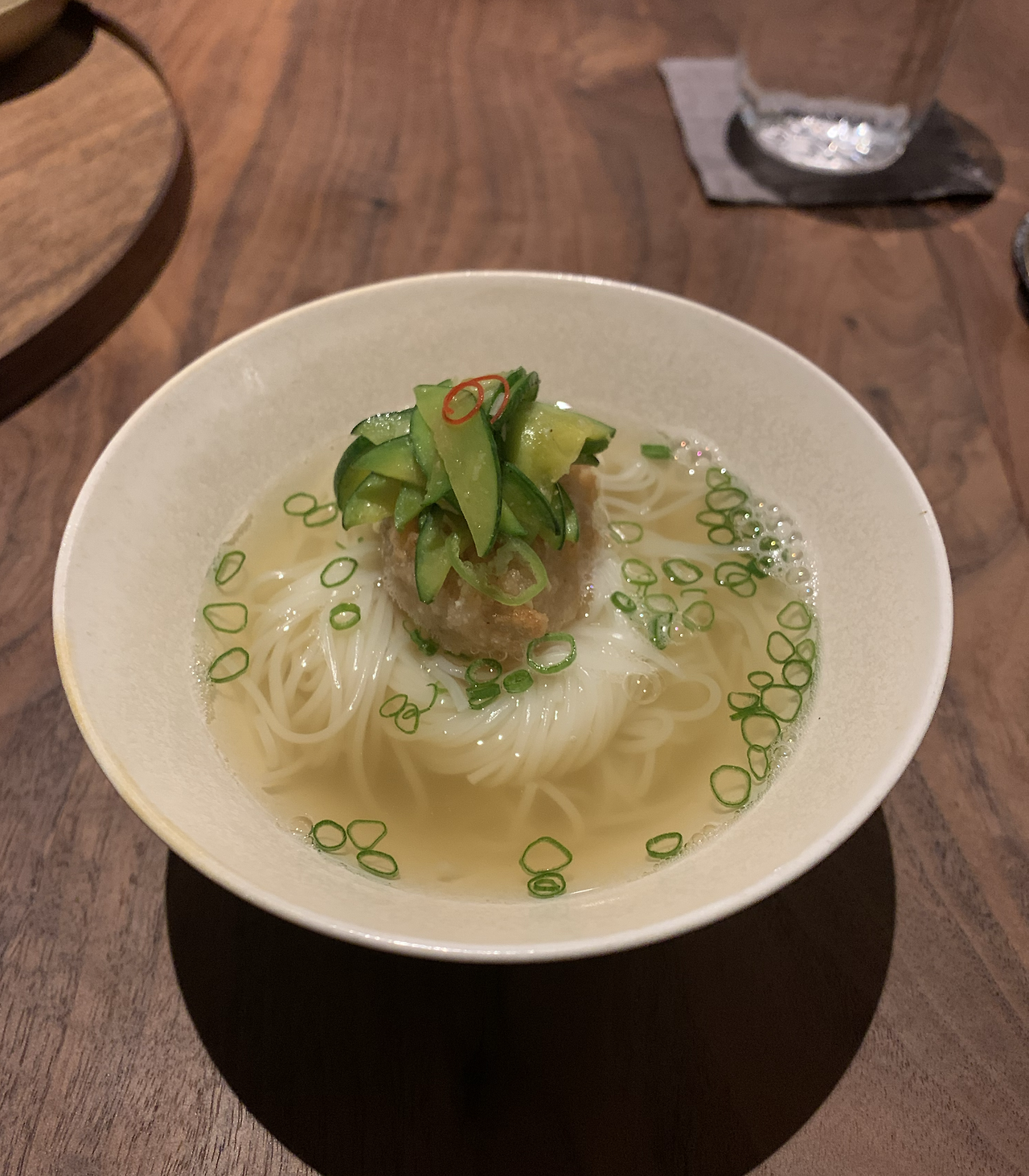 일반적은 잔치국수와 별반 다를 게 없네?라고 생각하려는데 육수를 뽑는 방식에 대해서 듣고 고개를 끄덕이면서 먹게 된다. 육수 자체는 콜두브루잉하는 기계에 냉침 출하는 형식으로 멸치의 맛을 추출한다고 한다. 사실 육수에 있어 가장 문제가 일정하지 않은 퀄리티인데 차가운 방법으로 육수를 만들면 그러한 변수가 하나 줄게 되니 육수 하나에도 신경을 많이 쓴다는 것이 굉징히 디테일한 곳이구나 라는 생각을 하게 됐다. 맛은 뭐 깔끔 그 자체이다. 그래서 멸치의 진한 향을 좋아하는 분들은 좀 임팩트가 강하게 오지 않을지도 모른다. 분명한 건 깔끔!