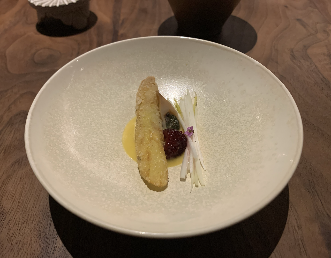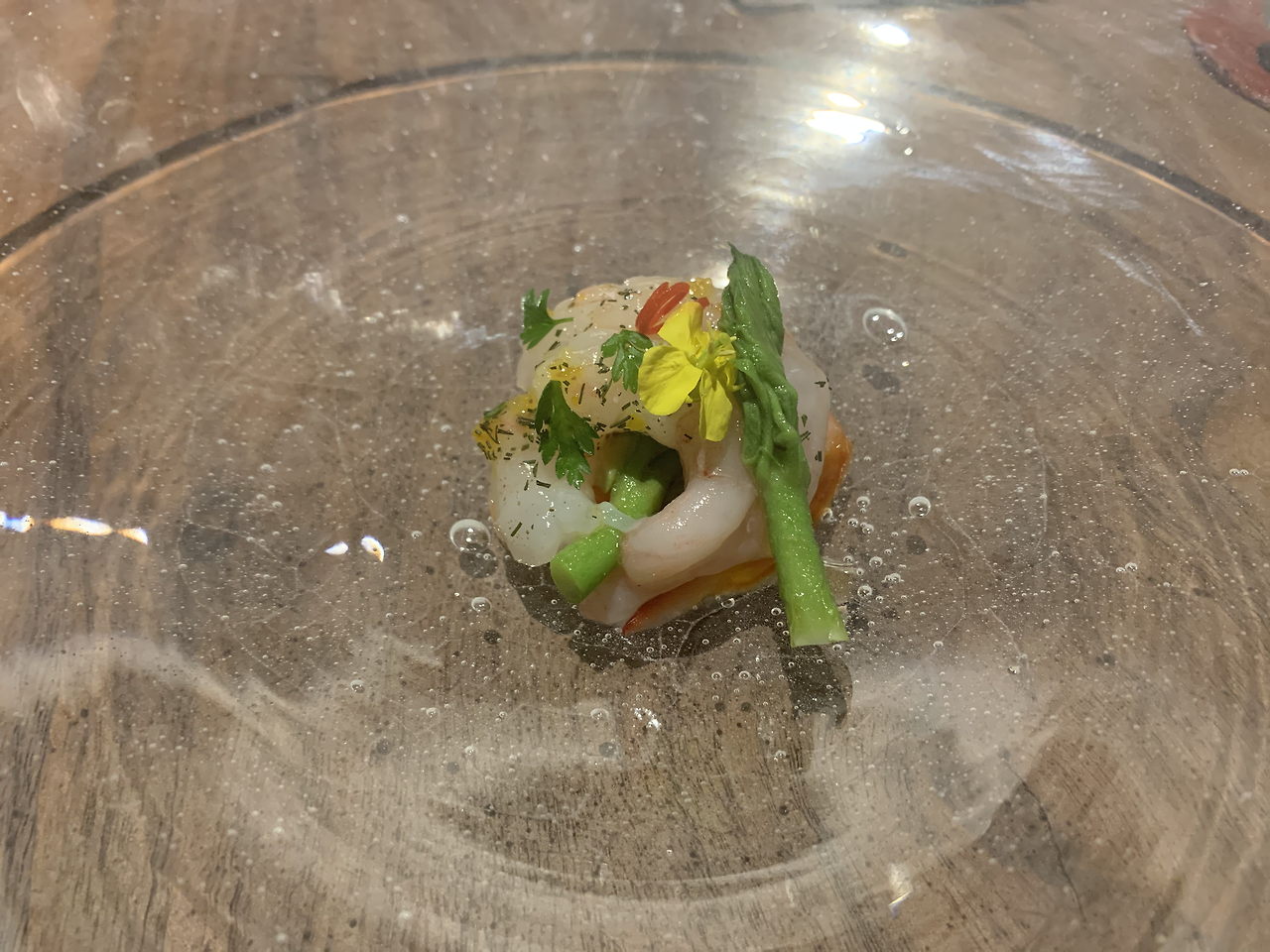 셰프가 엄선한 한입 요리 몇 가지가 나왔다. 첫 번째는 화이트 아스파라거스 머리 부분은 튀겼고 줄기 부분은 가는 채로 나왔고 가운데에 꼬막과 복분자 밑에는 노른자로 만든 소스가 있었다. 아스파라거스 하나를 두 가지의 전혀 다른 조리법으로 표현한 것이 인상적이다.