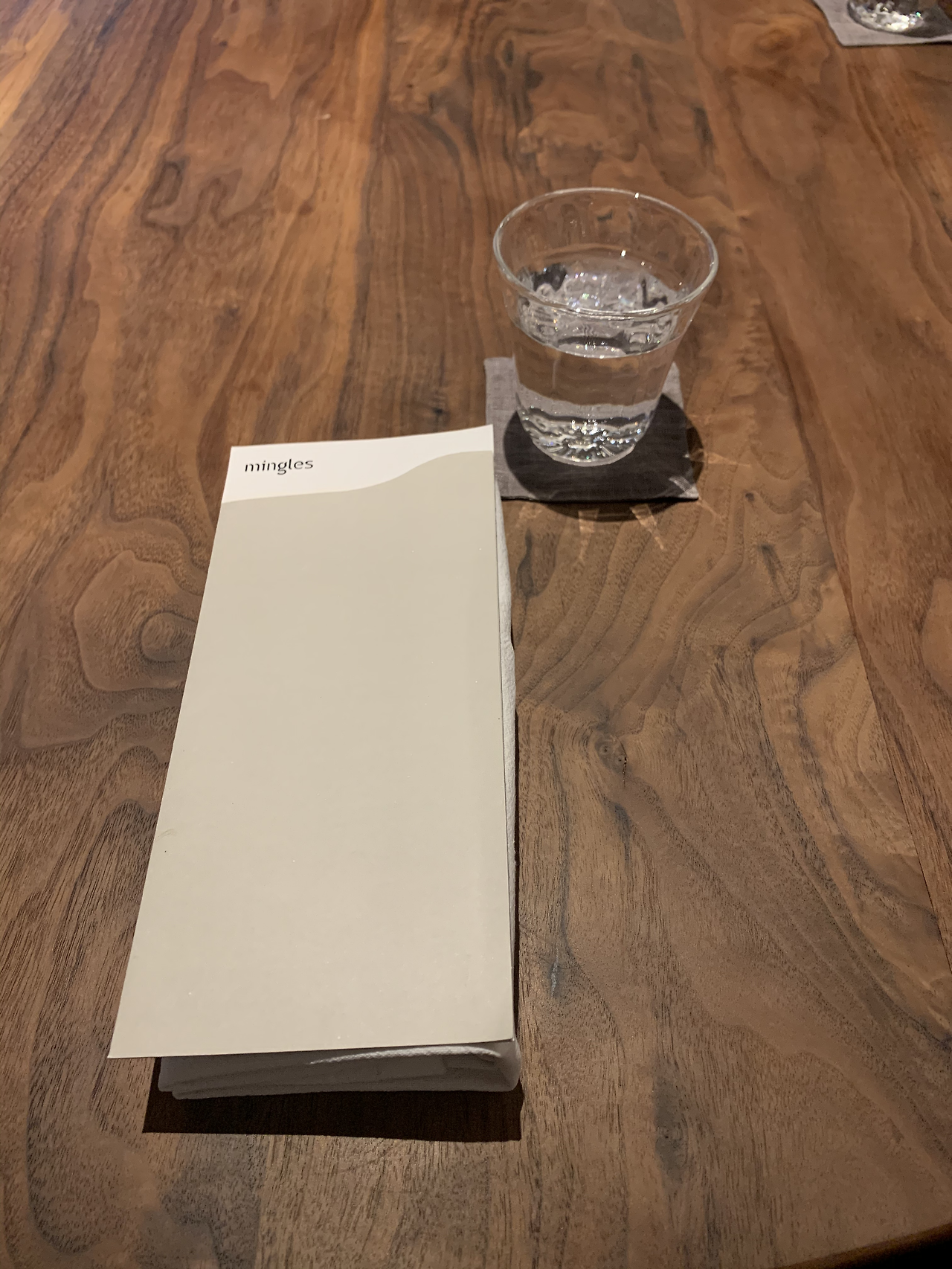 밍글스는 조명이 참 좋았다. 의도였는지 모르지만 물컵을 들었을 때 바닥에 비치는 빛의 모양이 컵마다 다르다. 뭔가 영롱한 느낌과 앞으로의 음식들이 기다려지는 순간, 젓가락이 묘하다. 저런 젓가락 하나 장만하고 싶다.