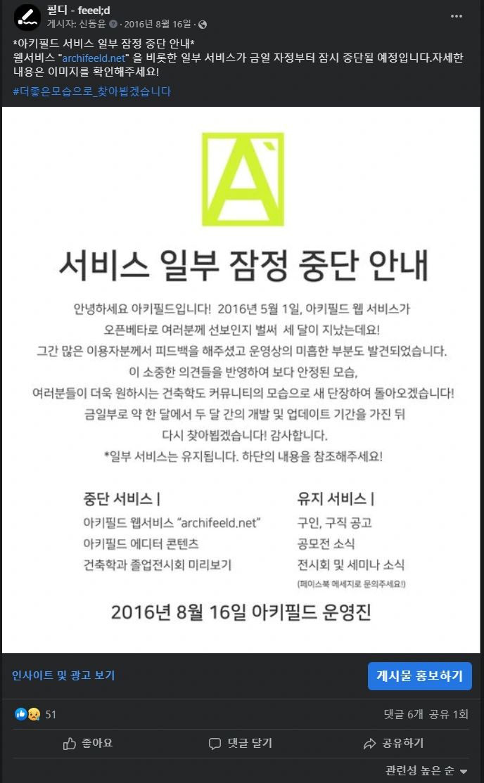 그럼에도 "우리 건축계에 이런 시도를 한 단체나 조직이 없었으며 심지어 자신들과 같은 학생이 운영하는 곳이니 한 번의 실수는 용서해 주자."는 여론과, "이런 작은 조직이 나중에 문제 해결 없이 성장하게 되면 결국 같은 문제는 반복될 것."이라는 여론이 형성되어 댓글창은 또다시 토론의 장이 되었다. 사건 발생 이후로 24시간 동안 잠을 자지 못한 채 댓글에 답변을 달다가 결국 장문의 반성문과 함께 서비스를 내리게 되었다. 만 24세였던 나로서는 조금은 힘든 시기였던것 같다.