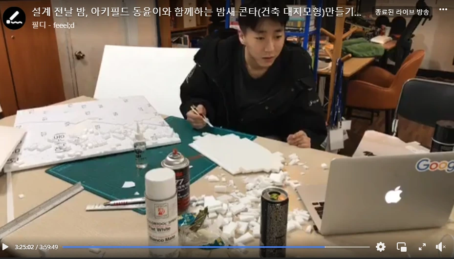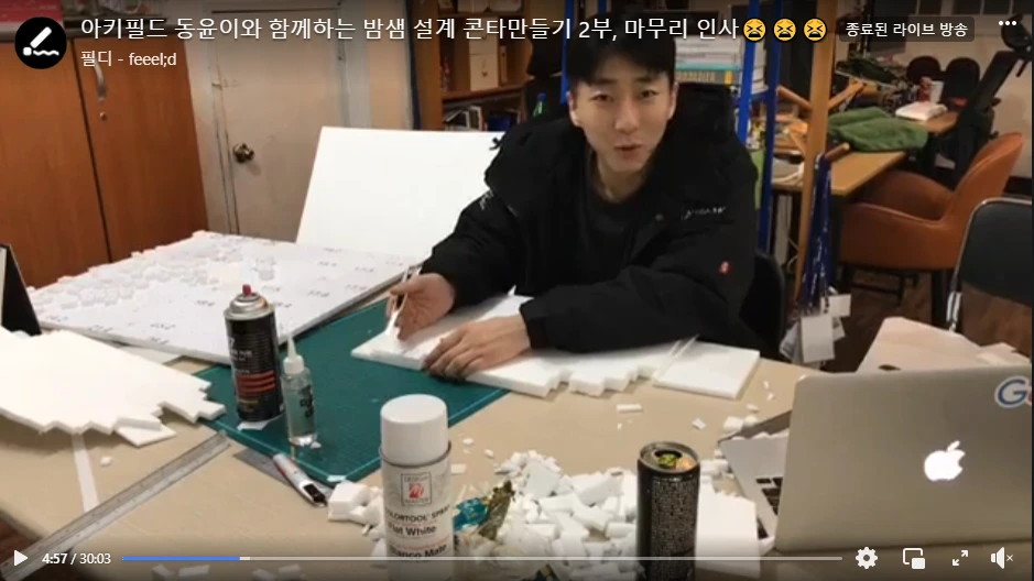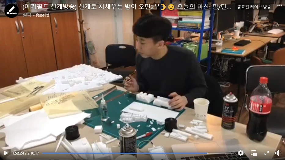 그리고 오히려 설계 수업 전날만 방송하는 것이 아닌 키고 싶을 때 가까운 화방에 가서 재료를 준비해 방송을 켰다. 그래서인지 모르겠지만 설계의 분량도 엄청 많아졌던 것 같다. 보통 설계 과제는 수업이 있기 전날에 몰아서 하는 경향이 있는데, 이때는 방송을 통해 설계를 평소보다 많이 하게 됐다. 오히려 좋았던 것일지도 모른다.