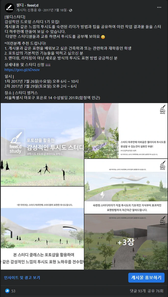 사실 어느 순간부터 취업은 선택지에 전혀 없었다. 당시에 새롭게 꽂힌 게 있었기 때문이다. 졸업전시를 준비하면서 연세대 건축학과 출신의 고재협이라는 아키텐에서 만난 선배가 있었다. 이 선배에게 당시 포토샵으로 투시도를 꾸미는 방법을 잠깐 배워서 그것을 졸업전시에 써먹었는데, 사실 스스로 5년간 혼자 독학해서 해오던 방식보다 이 선배에게 3시간 동안 배워서 써먹은 게 훨씬 더 멋지고 효율적인 방식이었다. 그래서 그 선배에게 "제대로 다듬어서 돈을받고 강의를 해보는 게 어떨까?"라는 제안을 하였고, 생각보다 흔쾌히 받아주었다. 당시 졸업전시를 도와주었던 후배들에게 시험 강의를 했고 그때 만들어진 결과물로 광고를 만들어서 필디에 업로드하였다. 업로드한지 하루 만에 200여 명의 수강생이 신청을 해주었고 1인당 3만 원의 수강료를 받게 되었다. 필디를 만든 이례로 첫 수익이 발생한 날이었다. 이날 사업자등록을 하며 "필디스터디"라는 새로운 서비스의 시초가 되었다.