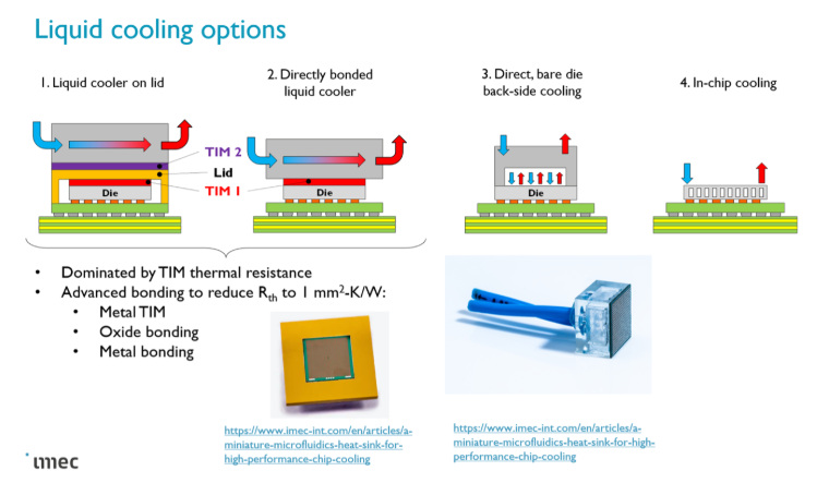 IMEC에서 발표한 liquid cooling 패키징. 칩이 더 작아지고 2.5D, 3D로 적층되면서 여러 발열 관리 패키징이 고안되고 있다.