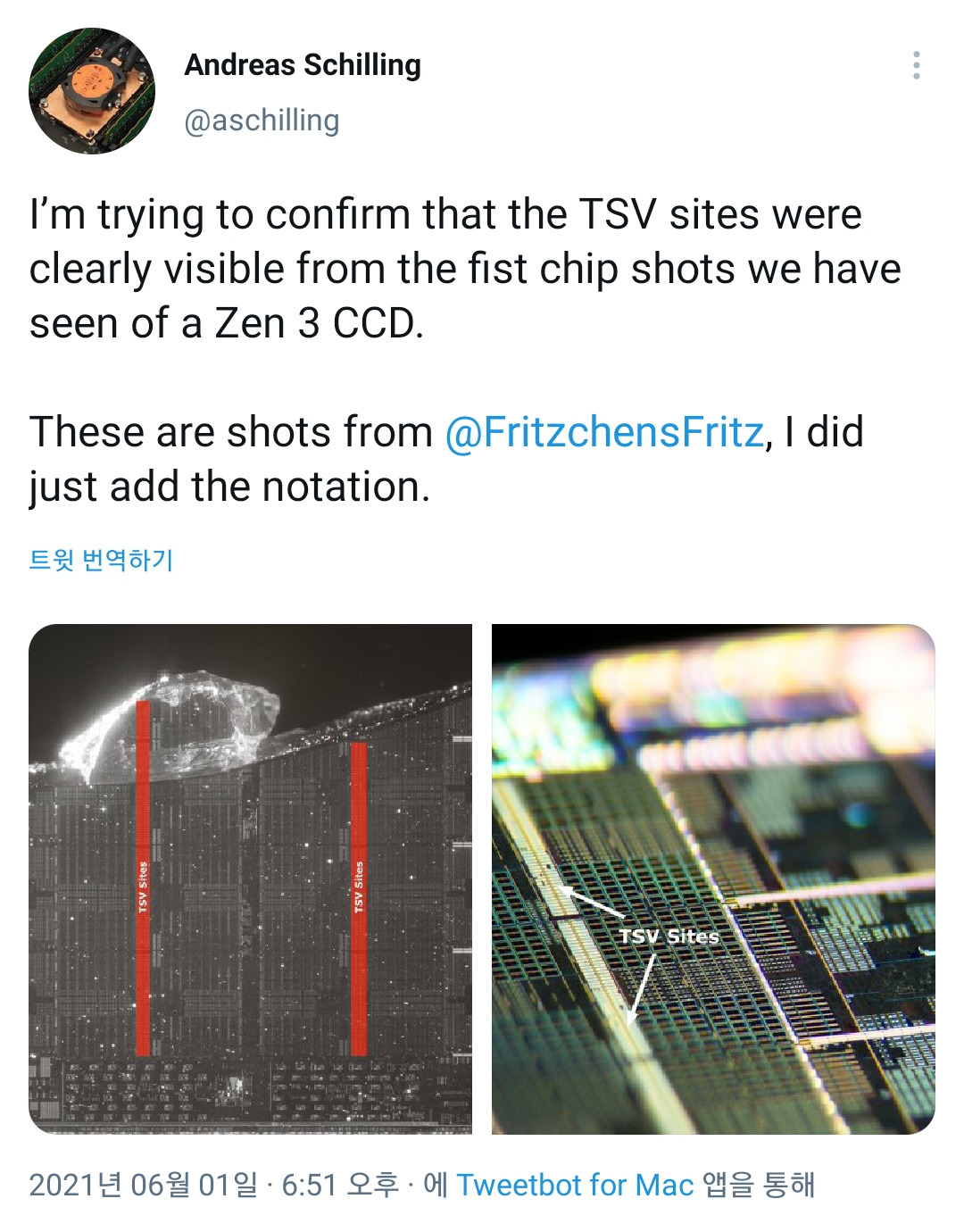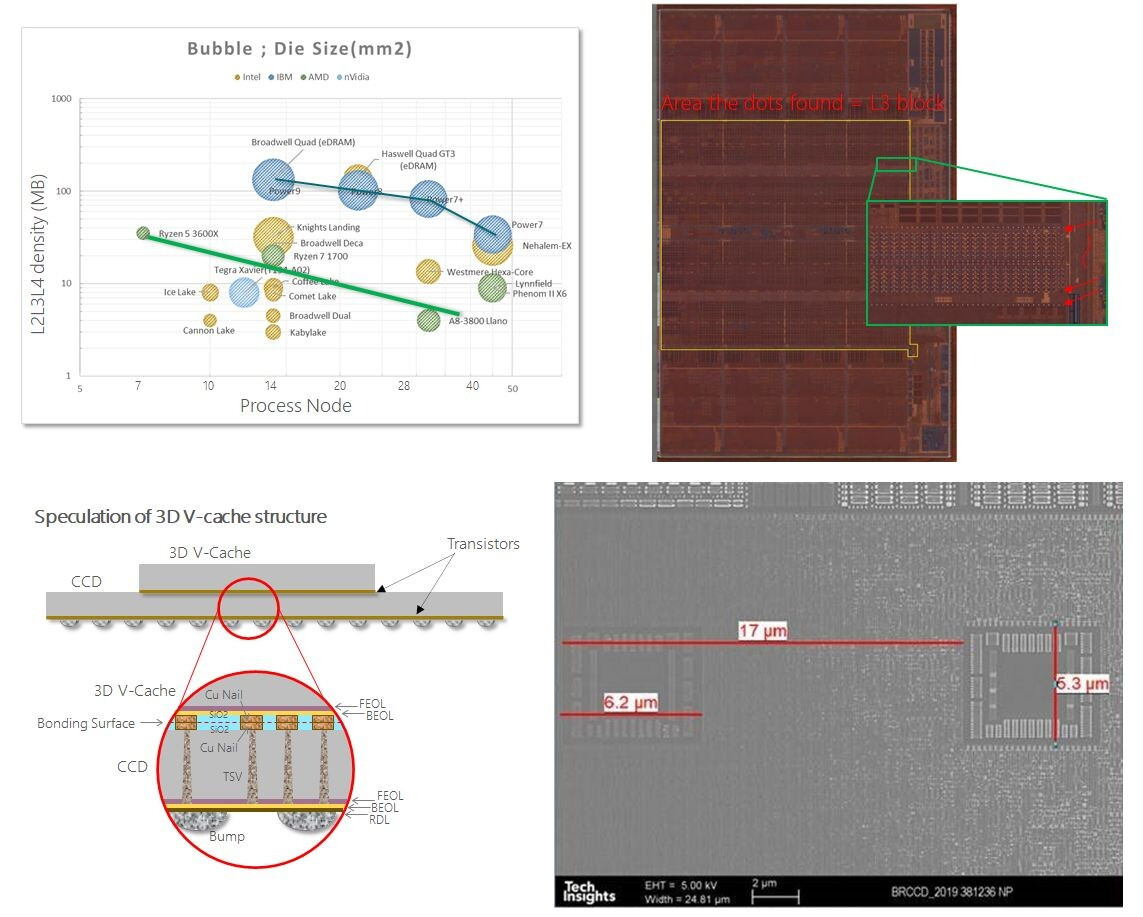 이번에 나온 설명은 새로 추가된 3D V 캐시가 L4 역할을 하는 게 아니라, 운영체제가 L3의 연속된 96MB 블럭으로 간주한다는 겁니다. 3D V캐시는 젠3 CCD와 같은 7nm 공정으로 제조된 SRAM 칩으로 크기가 6x6mm(36제곱mm)며, 32MB L3 SRAM가 있는 CCD 영역 위에 위치해있다. 크기가 17μm인 TSV 23,000개로 3D V 캐시를 메인 CCD 위에 연결하고 있다.
