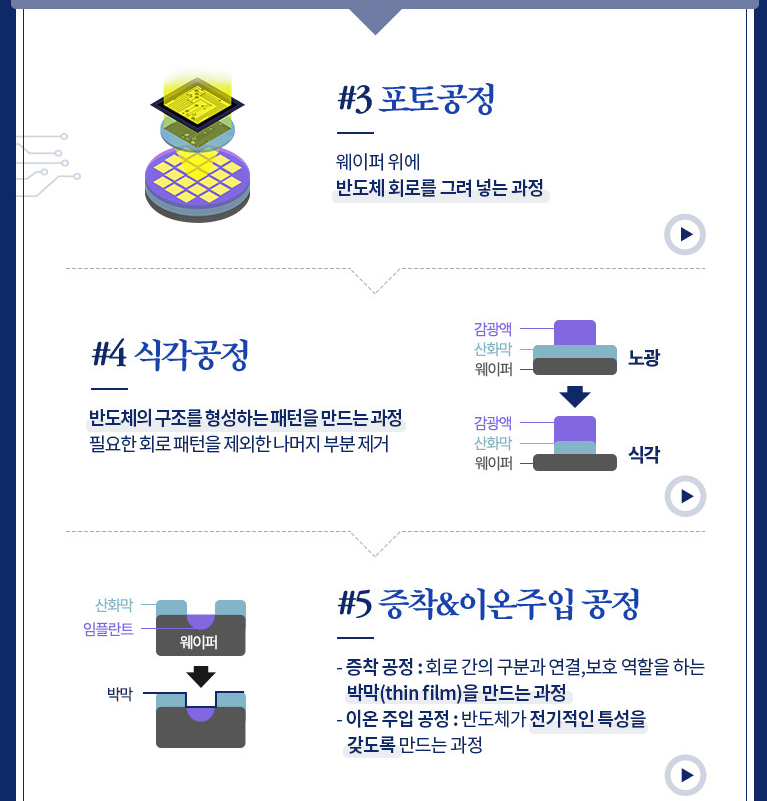 6. 반도체 공정은 크게 Deposition(증착) - Photo Ligthography(노광) - Etch(식각)과 같은 공정들로 반복되어 이루어진다.
