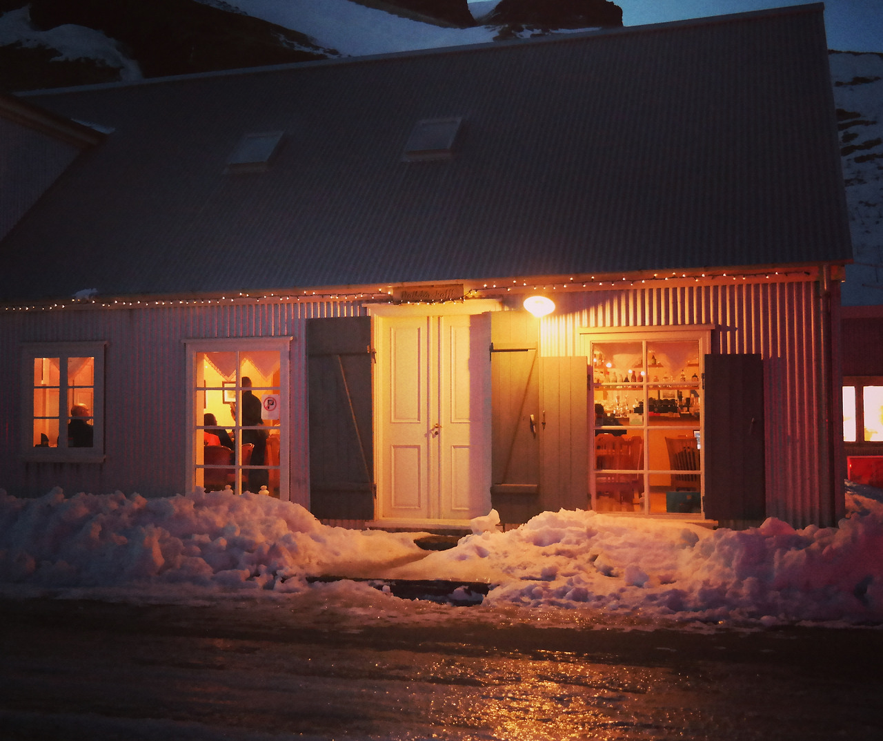 내가 참 좋아라 하는 영화는 귀염돋게 "겨울왕국". 어려서부터 볼 때마다 내 마음을 두준두준 설리설리하게 만들었던 장면들이 몇가지 있는데, 하나는 캐리비안의 해적처럼 해적들이 활기가 넘치는 항구마을로 돌아와 시끌벅쩍한 주점에 둘러앉아 럼주하나 손에쥐고 세상 더 자유로울수 없는 표정으로 다같이 노래부르며 호탕함을 뽐내는 장면이요, 다른하나는 왕좌의 게임처럼 코가 빨개질정도로 추운곳에서 모험을 하다가 해가지면 주황색 모닥불이 피워진 집에 들어와 그 위에 '뽀글뽀글' 듣기만해도 참 따뜻한 소리내며 끓고있는 아궁이 속 스프한그릇과 큰 통나무잔에 가득담긴 따뜻한 차 한잔 수염에 다묻히며 먹는 장면이라. 이 모든게 진짜 내 눈앞에 펼쳐지는 곳 아이슬란드. 4월부터 11월까지는 겨울왕국의 항구느낌 가득하다 11월부터 3월까지는 다시 '엘사빡침모드'의 겨울왕국이 펼쳐지는 이곳. 하루종일 빙하에서 코 훌쩍대며 트레킹하다 어느새 어두워져 따뜻한 핫초코 한잔 섹시하게 때리며 몸좀 녹이려 카페에 도착해 저 문을보는데 "어?나 왜 벌써 마신것같지"