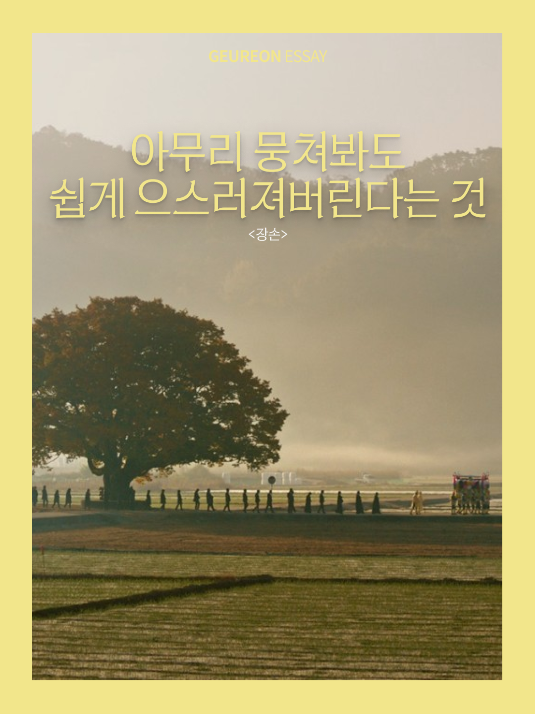 '모든 행복한 가정은 서로 닮았고, 모든 불행한 가정은 제각각 나름으로 불행하다.'라는 소설 <안나 카레니나>의 잘 알려진 첫 문장이 있다. 너무나도 강렬하고 완벽해 보이는 이 문장에 대해 평생 동안 크게 의심을 해온 적은 없었으나 영화 <장손>을 보고 나서는 이 문장만으로는 설명하기 어려운, 그러니까 마냥 행복하지도 또 그렇다고 불행하지도 않은 가정은 어떤 것일지를 생각해 보게 된다. 영화를 보며 가장 인상적으로 다가왔던 것은 ‘두부’라는 이미지였다. 콩을 곱게 갈아 하나로 섞고, 틀에 넣어 굳히면 단단한 형태를 갖춘 것처럼 보이지만, 막상 힘을 주면 너무도 쉽게 부서져버리는 것. 가족이라는 것도 어쩌면 이와 비슷한 것이 아닐까 하는 생각이 들었다. 함께 살아온 시간과 관계가 만들어낸 형태는 분명 존재하지만, 그것이 반드시 단단함을 의미하지는 않는다는 것. ‘하나로 뭉쳐 있다’는 감각이 때로는 얼마나 쉽게 무너질 수 있는 허상인지, 영화는 이 메타포를 통해 조용히 보여주고 있다.