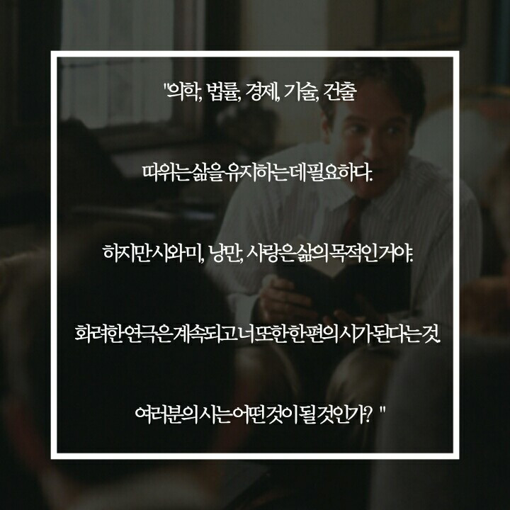 책에서 말한 그 좌절의 시간에 기술이나 과학은 무얼 할 수 있을까? 물론 VR기계를 끼고 슬픔을 잊거나 인공지능 siri와 함께 농담을 주고받는 등 각종 기기들로 무료함을 달랠 수는 있겠다. 하지만 그것이 과연 진정으로 그 시간을 극복한 것일까? 순간의 감정만을 잊게 해줄 뿐 절망과 좌절의 시간을 극복하고 그로인해 성장했다고 말하기는 어려울 것이다. 이과를 무시하는 발언은 아니다, 다만 경시되는 문학의 기능, 즉 문학만이 할 수 있는 일을 이야기 하고자 하는 것이다. 문학을 통해 사람들은 어쩌면 인생의 3분의 2를 넘길 수도 있는 그 좌절의 시간 속에서 무너지는 것이 아니라 더 나은 눈을 가질 수 있다는 것이다. 문학에는 힘이 있다. 어떤 첨단 기술도 가지지 못한 힘. 바로 세상을 선명하게, 더 맑고 또렷하게 볼 수 있도록 만드는 힘이다.