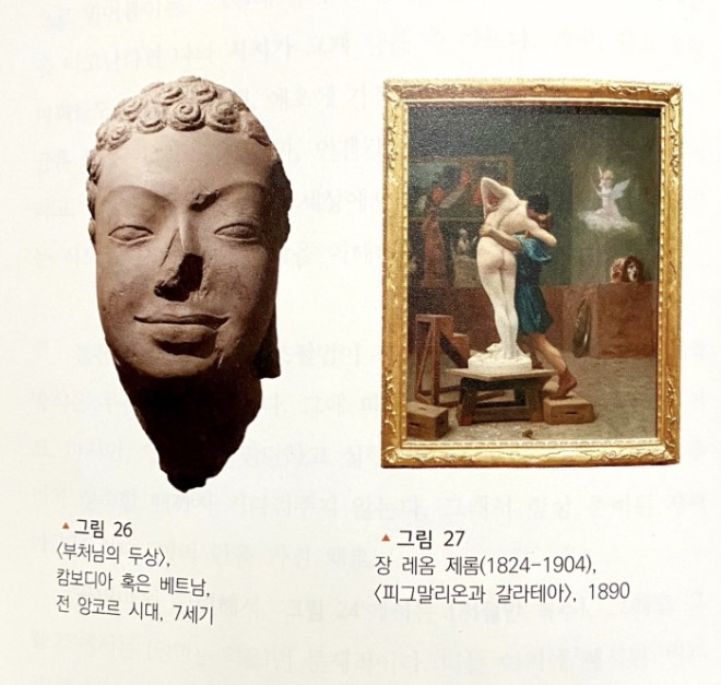 가장 인상 깊었던 분석은 174쪽, 7세기에 만들어진 <부처님의 두상>과 장 레옴 제롬의 <피그말리온과 갈라테아>(1890)의 작품 비교였다. 먼저 감정의 ‘면적’을 측정하는 ‘소대비’에 따르면 전자는 음기를 띄고, 후자는 양기를 띤다. 나 역시 이 두 작품을 보았을 때 전자는 매우 평화로워 그 기운이 음기일 것이라 추측하고 후자는 매우 강렬해 양의 기운이 강하다고 생각했다. 그러나 좀 더 깊숙이 분석해 감정의 온도나 색 등 모든 것을 종합했을 때, <부처님의 두상>은 양기도 음기도 아닌 중간 정도의 ‘잠기’, <피그말리온과 갈라테아>는 ‘음기’를 띄고 있다는 결론이 났다. 감정이라는 것은 표면적으로 판단할 수 있는 것이 아니라 다양한 요소들을 깊게 들여다보고 이해할 때에야 정확하게 인식할 수 있었던 것이다. 이를 통해, 내가 어떤 현상을 보았을 때 표면적으로 보고 생각하는 것과는 전혀 다른 감정을 상대가 띄고 있을 수도 있겠구나, 하는 생각을 했다. 나는 얼마나 많이 표면적으로만 상대의 감정을 간파했다고 생각하곤 했었나, 성찰이 되었다.