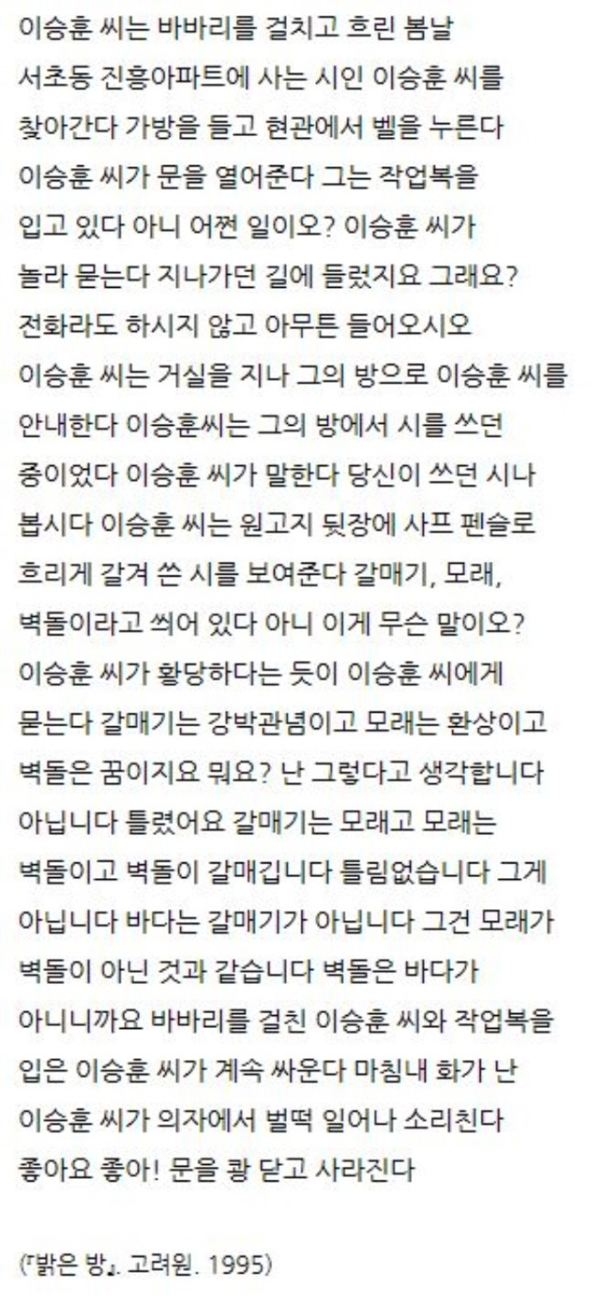 읽다 보면 멀미가 날 것 같은 위 시는 국내 해체시로 유명한 '이승훈' 시인의 시 '이승훈씨를 찾아간 이승훈씨'이다. '20세기 한국문학의 탐험(장석주)'에는 해체시를 다음과 같이 정의 하고 있다.