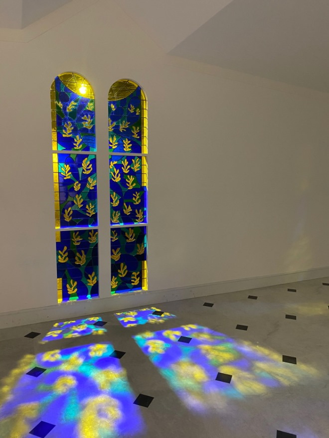 그는 건출 설계부터 스테인드 글라스와 실내벽화, 실내장식, 사제복 등 모든 부분에 직접 관여하였다고 한다. 이번 전시에서는 특히 기획자들의 뼈를 갈아(?) 재현한 스테인드글라스가 단연 압도적인 볼거리였다. 가위로 종이를 오리던 자신의 작품 <재즈>처럼 이번에는 빛을 오려냈다는 도슨트의 설명이 기억에 남는다.