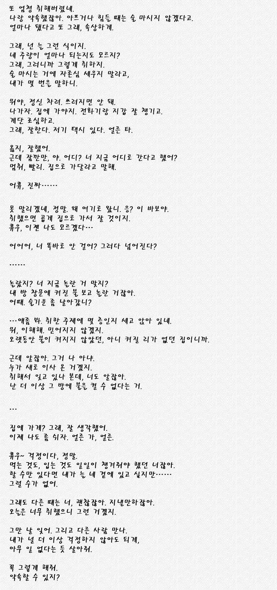 책상 앞에 앉아 널브러진 만년필을 집어든다. 혹시 잉크가 말랐을까 싶어 몇 번 흔든다. 너의 목소리를, 나에게 전하는 너의 편지를 적어놓은 옆 페이지에 내 목소리를, 너에게 전하는 편지를 적어내려간다.
