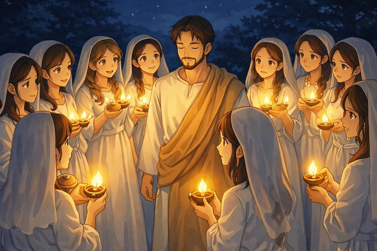 등과 기름까지 준비했던 지혜로운 처녀들은 등에 바로 기름을 채워 신랑을 맞이하러 갈 수 있었지만, 기름을 준비하지 않은 처녀들은 허둥대다가 결국 혼인잔치에 참여하지 못했다.