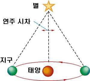 : |천문|어떤 천체를 지구에서 본 방향과 태양에서 동시에 본 방향의 차이. 각도로 값을 나타내며, 이것으로 천체의 거리를 측정한다.