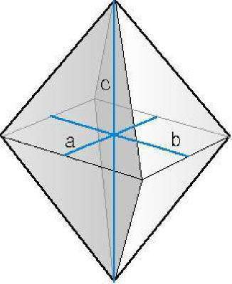 : |광업|서로 직각으로 만나는 세 결정축 가운데 가로축 둘은 길이가 같고, 세로축 하나만 길이가 다른 결정체.