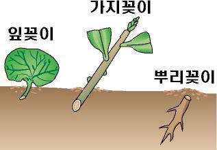 : |농업|식물의 가지, 줄기, 잎 등을 자르거나 꺾어 흙 속에 꽂아 뿌리 내리게 하는 일.