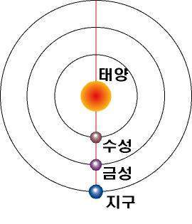 : 수성과 금성 같은 내행성이 태양을 사이에 두고 지구와 한 직선 위에 놓이는 현상.