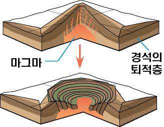 : |지구/지리|강렬한 폭발에 의해 화산의 분화구 주변이 붕괴·함몰되면서 생긴 대규모의 원형 또는 말발굽 모양의 우묵한 곳. 지름은 3km 이상에서 수십 km에 이르는 것도 있다. 생긴 원인에 따라 함몰 칼데라·폭발 칼데라·침식 칼데라 등으로 분류하지만, 대개는 함몰 칼데라이다.
