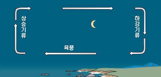 : |지구/지리|해안 지방에서 바다와 육지의 기온 교차 때문에 낮과 밤에 방향이 바뀌어 부는 바람. 여름철 갠 날에 발달한다. 낮에 바다에서 육지로 부는 해풍과 / 밤에 육지에서 바다로 부는 육풍이 있다.