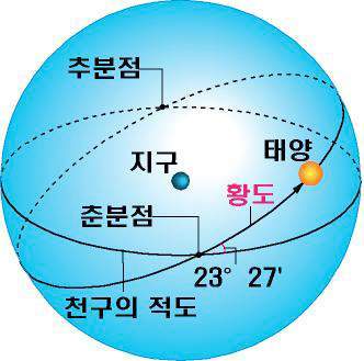 : |천문|태양의 둘레를 도는 지구의 궤도가 천구에 투영된 궤도. 천구의 적도면에 대해 황도는 약 23도 27분 기울어져 있다. 적도와 만나는 두 점을 각각 춘분점, 추분점이라 한다.