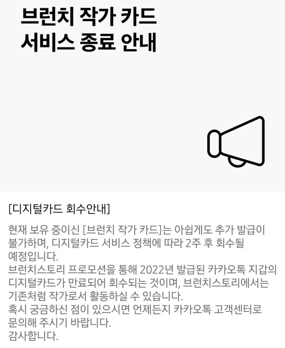 그런데 이 카드는 추가 발급도 갱신도 없이 회수될 것이라 합니다. 오프라인 실물 카드로 전환 발급하여 카카오프렌즈 굿즈 살 때 할인을 해주긴커녕 말이지요. 브런치 작가로서 글을 계속 받겠지만 이제 작가란 미명하에 뽑아먹을 만큼 뽑았으니 나가고 싶으면 말리진 않을 것처럼 들리지요.차라리 갱신을 통해 글쓰기를 멈춘 작가들에게 프로모션을 유도하는 방향이 나았을 텐데요.