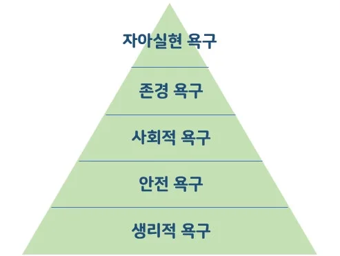 심리학자 에이브러햄 매슬로우(Abraham Maslow)는 인간의 욕구가 그 중요도에 따라 낮은 수준에서 높은 수준의 욕구로 계층을 형성하며, 낮은 단계의 욕구가 충족돼야 다음 단계의 욕구로 나아갈 수 있다고 하였다. 그 단계는, 1단계 생리적 욕구, 2단계 안전 욕구, 3단계 사회적 욕구, 4단계 존중 욕구, 5단계 자아실현 욕구를 뜻한다.