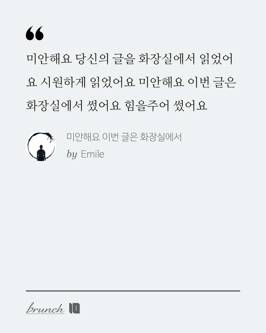 미안해요 당신의 글을 화장실에서 읽었어요 시원하게 읽었어요 미안해요 이번 글은 화장실에서 썼어요 힘을주어 썼어요 왜 글은 아름다운 궁전보다 윤이나는 책상보다 화장실에서 더 잘 읽히
