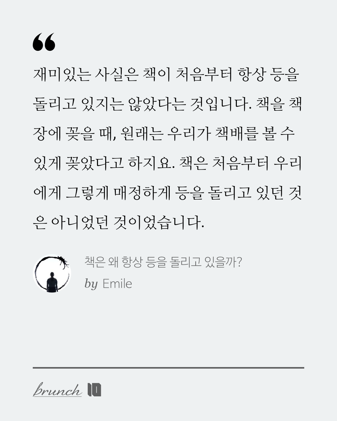 책도 등에 문신을 하기 전까지는 깨끗한 등판이었다 | 책은 왜 항상 등을 돌리고 있을까요? 책을 책장에 똑바로 잘 꽂아 놓았을 때, 우리가 보고 있는 부분은 책의 등에 해당합니다. 그러므로 책