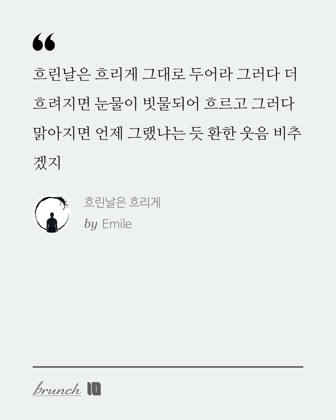 feat 두어라 | 흐린날은 흐리게 그대로 두어라 그러다 더 흐려지면 눈물이 빗물되어 흐르고 그러다 맑아지면 언제 그랬냐는 듯 환한 웃음 비추겠지 날씨를 바꿀수도 구름을 밀어낼수도 하늘을 닦